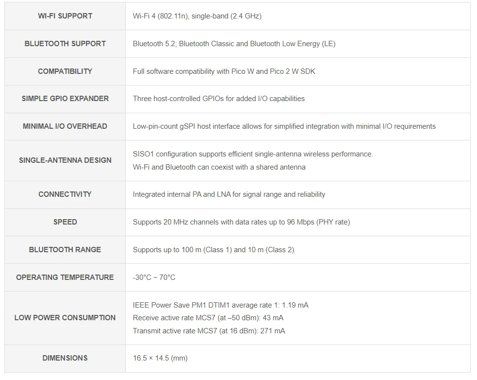 Adopta el CYW43439 de Infineon, un dispositivo combinado de un solo chip que incluye 1 × 1 Wi-Fi 4 (802.11n) de una sola banda de 2,4 GHz y Bluetooth 5.2 para aplicaciones de bajo costo