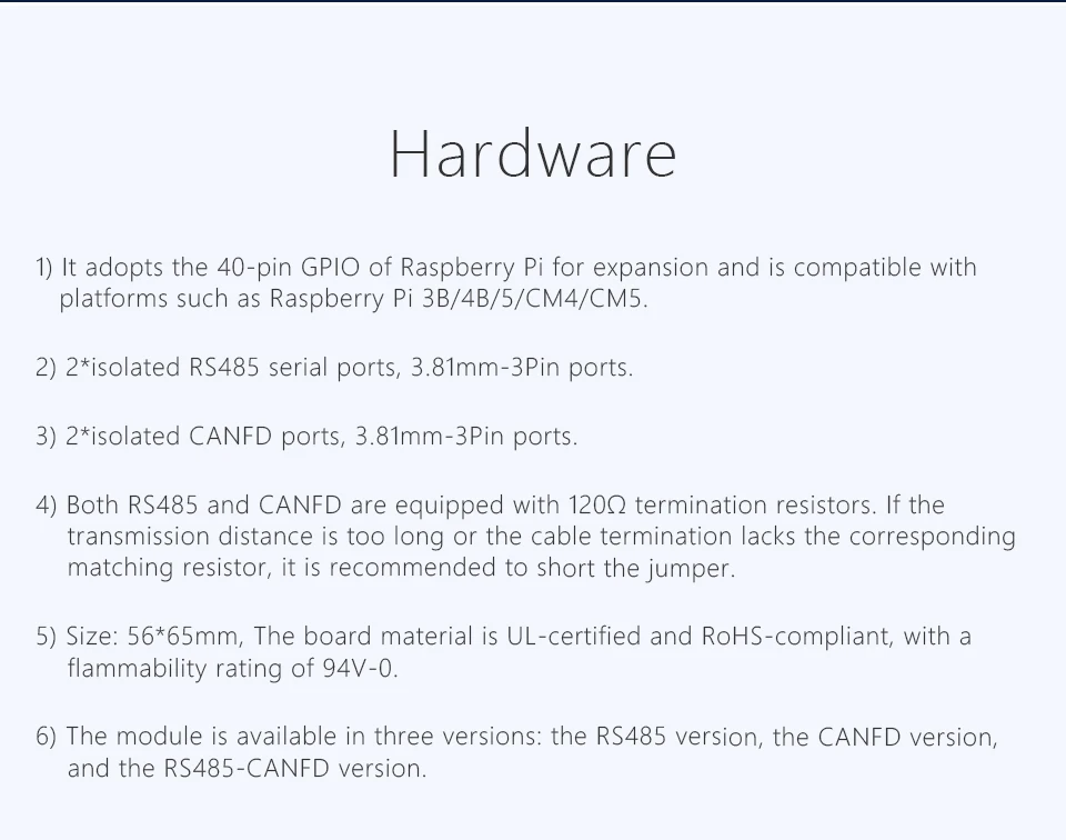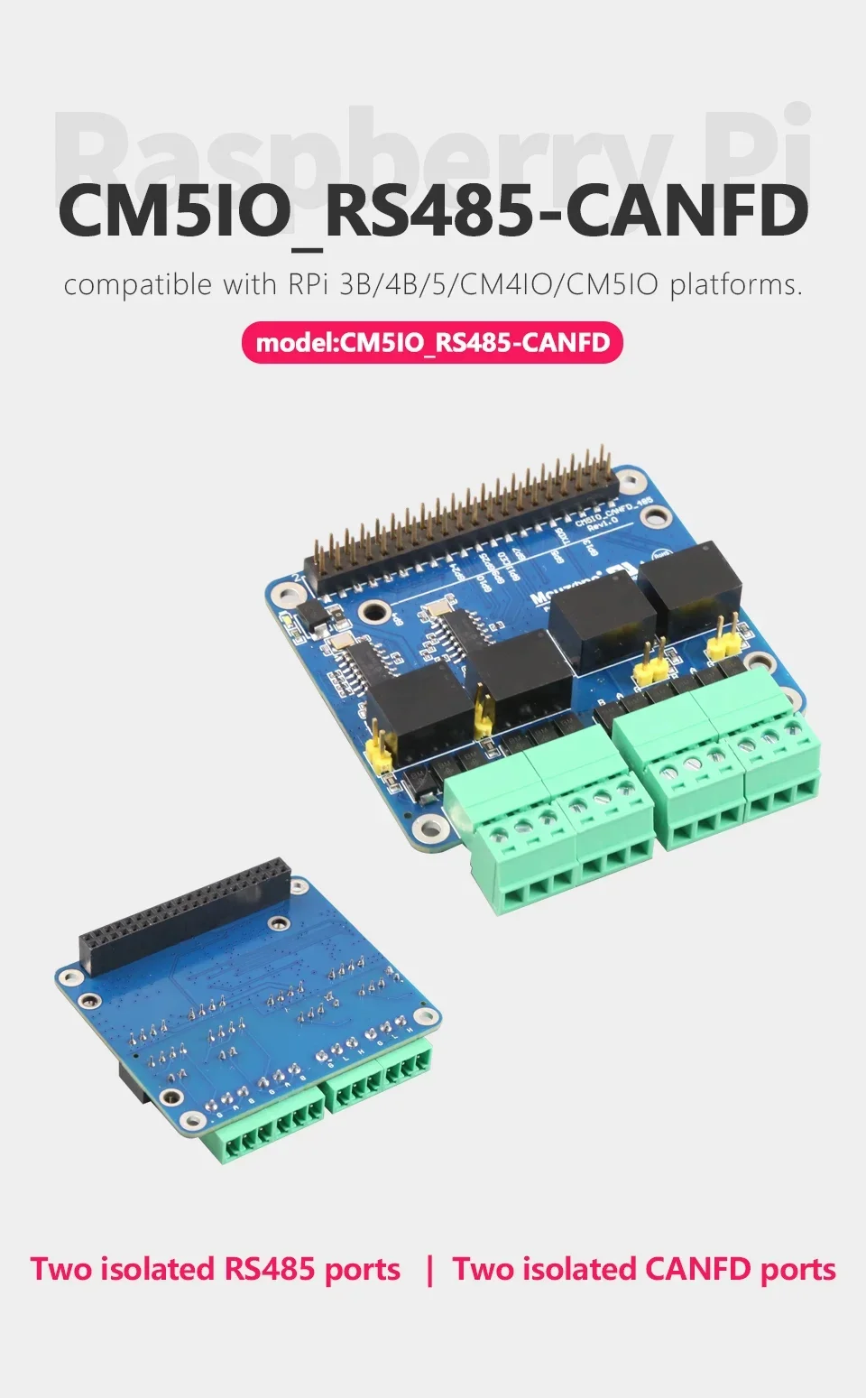 Comprar Módulo Raspberry Pi CM5IO_RS485-CANFD para plataformas Raspberry Pi CM5,RPi5,4B,3B,CM4,CM5IO Dos puertos RS485/CANFD aislados opcionales