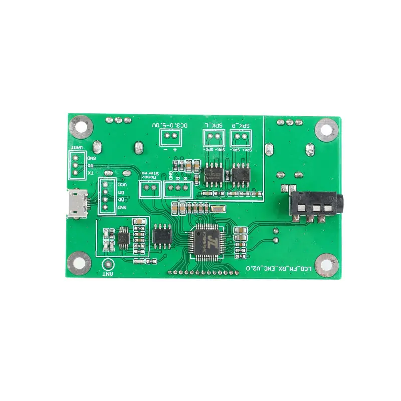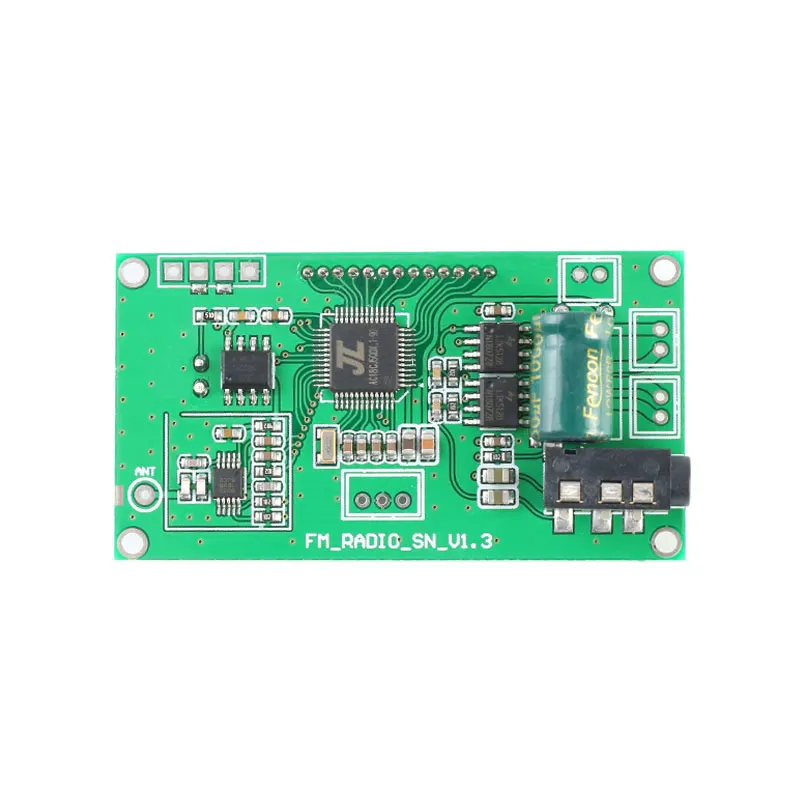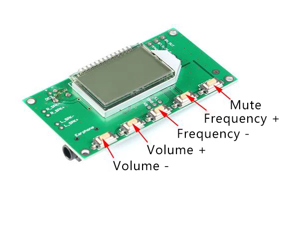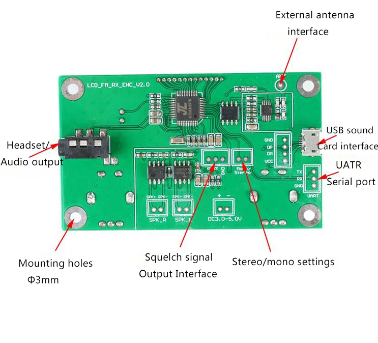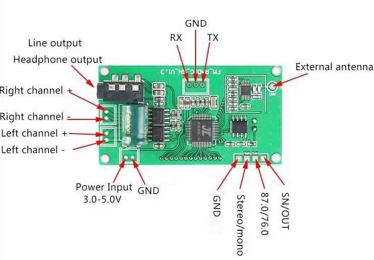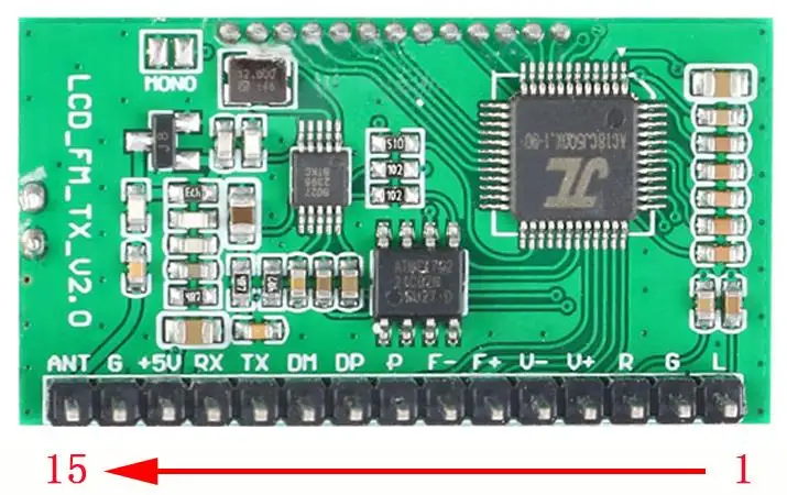 1 (L): salida de audio del canal izquierdo2 (G): tierra de audio3 (R): salida de audio del canal derecho4 (V+): Pulsación corta volumen + / pulsación larga continua +5 (V-): Volumen de pulsación corta - / pulsación larga continua -6(F+): Presione brevemente una estación / presione prolongadamente hacia abajo para buscar una estación7(F-): Presione brevemente la estación anterior/presione prolongadamente para buscar la estación8(P): Presione brevemente silencio/presione prolongadamente búsqueda de banda completa y guardado de la estación9 (DM): cable USB DM10 (DP): cable de datos USB DP11 (TX): remitente de puerto serie TTL12 (RX): receptor de puerto serie TTL13 (+5 V): entrada de alimentación de 5 V (ancho rango de 3-5 V)14 (G): tierra eléctrica15 (ANT): Extremo de antena de radio FM externa
