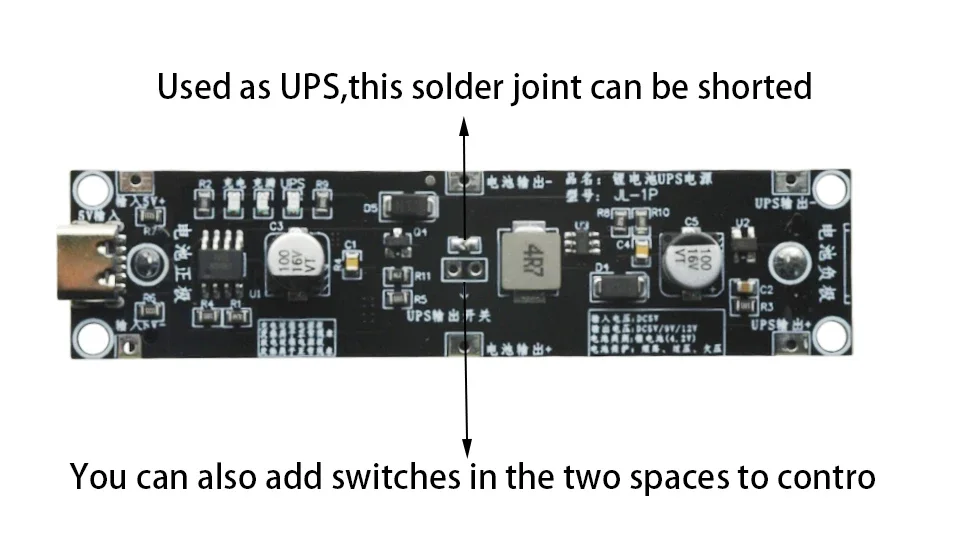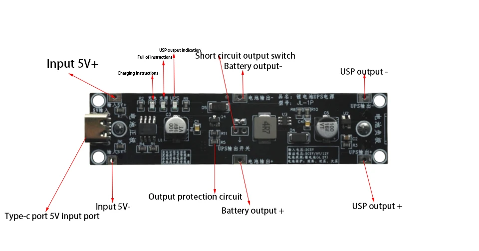 7) Descripción de la interfaz (consulte la imagen de abajo): puerto TYPE-C y entrada estándar 5V+,5V-son puertos de fuente de alimentación externos, puede elegir uno de los dos.Los puertos de salida están marcados con USP+ y Ups. Conecte la batería de litio 18650 a la caja de soldadura en la parte posterior.También puedes conectar otras baterías de litio.