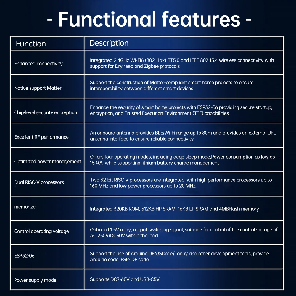ESP32-C6 nativamente admite Matter gracias a su conectividad inalámbrica mejorada.Su pila de protocolos inalámbricos admite WiFi de 2,4 GHz 6, [email protected] Zigbee y Thread (802.15.4)。 Como primer dispositivo compatible con Thread, es muy adecuado para proyectos de construcción que cumplen con los estándares Matter, lo que permite la interoperabilidad entre dispositivos domésticos inteligentes.
