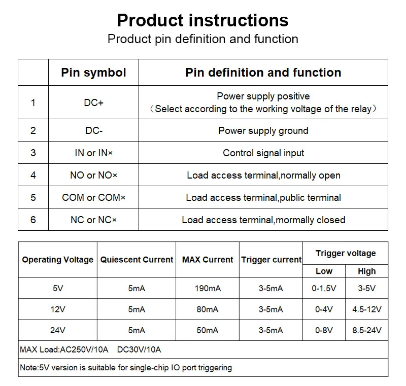 1. El módulo adopta un relé, y la interfaz normalmente abierta es una gran carga: CA 250V/10A, CC 30V/10A;