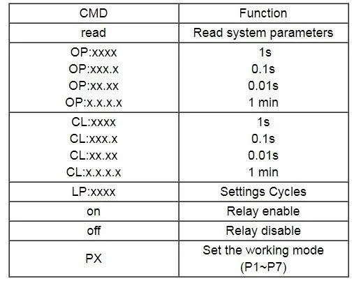 Aspectos destacados del producto:Pantalla con dos columnas LCD, puede mostrar los parámetros directamente;Modo de disparo: nivel alto y bajo, cambiar la cantidad. Satisface la mayoría de las necesidades.Fuente de alimentación: 6 ~ 30 V, también admite micro USB 5,0 V, muy conveniente. Conexión anti-retroceso de la fuente de alimentación.Los parámetros se pueden modificar a través de UART.Botón Parar para proporcionar función de parada de emergencia.5 minutos sin ninguna operación en un estado de bajo consumo.Cualquier acción despierta.Los parámites OP/CL/LOP se pueden modificar individualmenteTodos los parámetros se guardan automáticamente apagando.Introducción al modo de trabajo (P1~P7)P1: Después de activar la señal, la conducción del relé en el tiempo OP luego se desconecta; En el tiempo OP, la señal no es válida.P2: Después de activar la señal, la conducción del relé en el tiempo OP luego se desconecta; En el tiempo OP, la señal activa un nuevo temporizador.P3: Después de activar la señal, la conducción del relé en el tiempo OP luego se desconecta; En el tiempo OP, el temporizador de reinicio del disparador de señal, el relé se desconecta y la sincronización de parada.P4: Cuando se activa, después de desconectar el relé del tiempo CL, tiempo OP de conducción del relé, una vez completado el cronometraje, desconecte el relé.P5: Cuando se activa, después del tiempo de operación de conducción del relé, el relé desconecta el tiempo CL y luego loops la acción anterior, da la señal nuevamente en el bucle, los relés se desconectan, detiene el temporizador y el número de ciclos (LOP) puede ser configurado;P6: Cuando se activa, después del tiempo de operación de conducción del relé, el relé desconecta el tiempo CL y luego loops la acción anterior, la señal no es válida en el bucle, se puede configurar el número de ciclos (LOP);P7: Función de retención de señal: La señal se mantiene, la sincronización se borra y la conducción del relé; cuando la señal desaparece, el relé se desconecta después del cronometraje OP; durante el cronometraje, hay otra señal y el cronometraje se borra;Parámetros del producto:Fuente de alimentación: 6V~30V y micro USB 5,0 VFuente de señal de disparo: nivel alto (0,0 V ~ 24,0 V), nivel bajo (0,0 V ~ 0,2 V), señal de interruptor.Carga máxima de salida: CC 30 V 5 A y CA 220 V 5 A.Corriente estática: 15 mA Corriente de funcionamiento: 50 mA.Vida útil: más de 100.000 veces; temperatura de trabajo: -40-85°C; Tamaño: 8,0*3,8*1,9 cm.Aislamiento de optoacoplador, fuerte capacidad antiinterferencias, placa de circuito de grado industrialRango de tiempo:0,01 segundos ~ 9999 minCómo elegir el rango de tiempo:En la interfaz de modificación de parámetros OP/CL, presione brevemente el botón STOP para seleccionar el rango de tiempo.Rango de tiempo XXXX: 1 segundo ~ 9999segXXX.X Rango de tiempo: 0,1 segundo ~ 999,9 segundosXX.XX Rango de tiempo: 0,01 segundos ~ 99,99 segundosX.X.X.X.X Rango de tiempo: 1 min ~ 999,9 minPor ejemplo, si desea configurar el OP en 3,2 segundos, mueva el punto decimal a diez dígitos.Pantalla LCD 003.2Descripción del parámetro: tiempo de encendido OP, tiempo de apagado CL, tiempos de ciclo LOP (1 - 9999 veces, "----" representa un número infinito de ciclos)Configuración de parámetros:Mantenga presionada la tecla SET para ingresar a la interfaz de configuración;Primero configure el modo de trabajo, el modo de trabajo parpadea como recordatorio, configure el modo de trabajo presionando las teclas ARRIBA/ABAJO;Presione brevemente el botón SET para seleccionar el modo de trabajo e ingresar la configuración de parámetros del sistema.En la interfaz de configuración de parámetros del sistema, presione la tecla SET para cambiar los parámetros del sistema que se va a modificar y presione/mantenga presionada la tecla ARRIBA/ABAJO para modificar.(Nota: presione brevemente SET en P-1~P-3, el modo P-7 no es válido);En la interfaz de modificación de parámetros OP/CL, presione brevemente STOP para cambiar la unidad del temporizador (1s/0,1s/0,01s/1min);Después de configurar todos los parámetros, presione y mantenga presionado el botón SET durante más de 2 segundos para soltar la mano, guarde la configuración de parámetros y salga de la interfaz de configuración.Funciones de carga remota de datos y configuración de parámetros:El sistema admite funciones de lectura y escritura de parámetros UART;UART: 9600,8,1