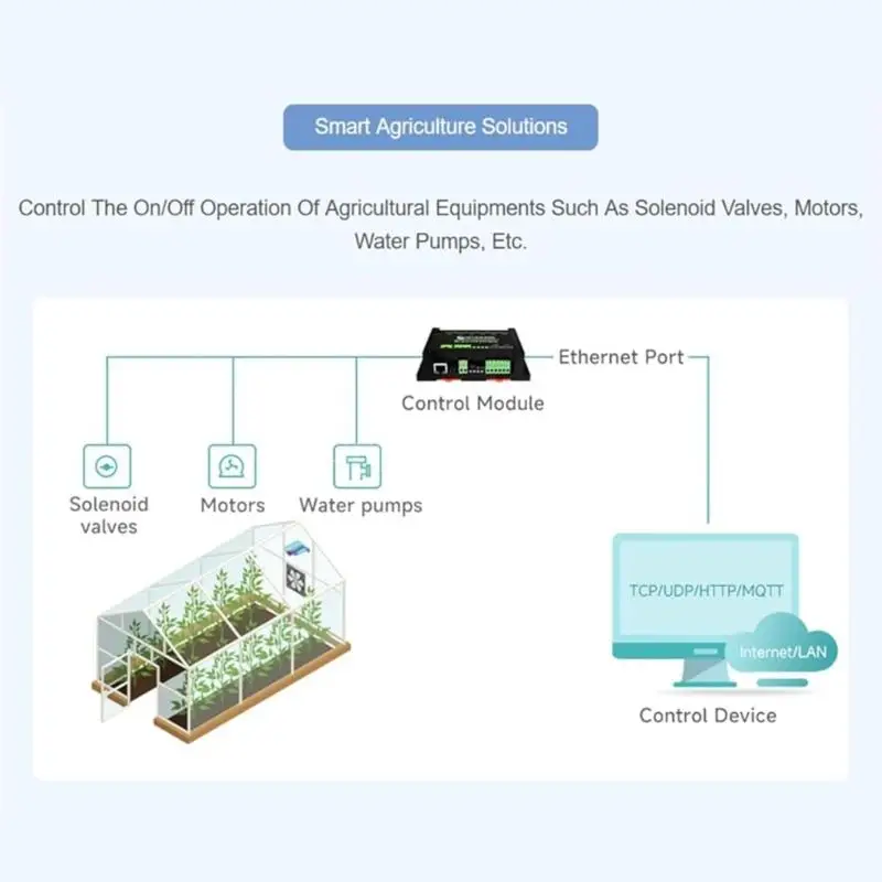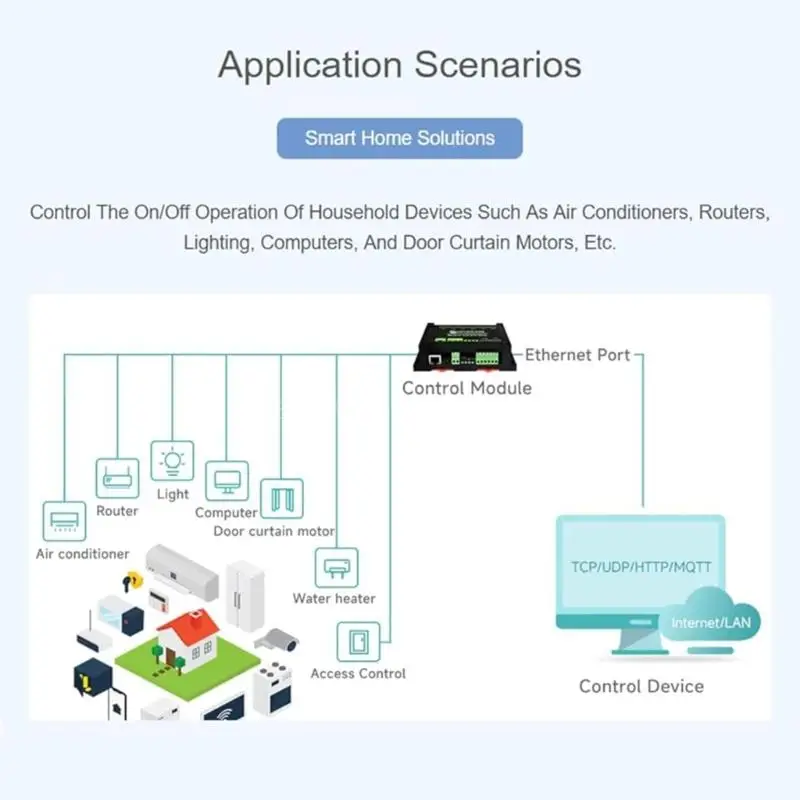 Admite el envío de comandos Modbus RTU/TCPprotocol Puerto Ethernet para controlar relés y varios dispositivos. Admite múltiples modos de comunicación, adopta Modbus admite modos TCPServer / TCPClient / UDP/UDPMulticast / HTTP / MQTT. Admite protocolo Modbus RTU Modbus TCP.