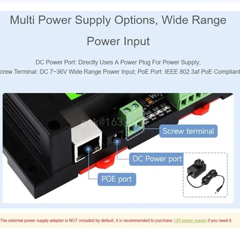 Puerto de alimentación: utiliza directamente un enchufe de alimentación para la fuente de alimentación; de tornillo Terminal: entrada de alimentación de amplio rango DC7 ~ 36V; Puerto PoE: compatible con IEEE802.3af PoE