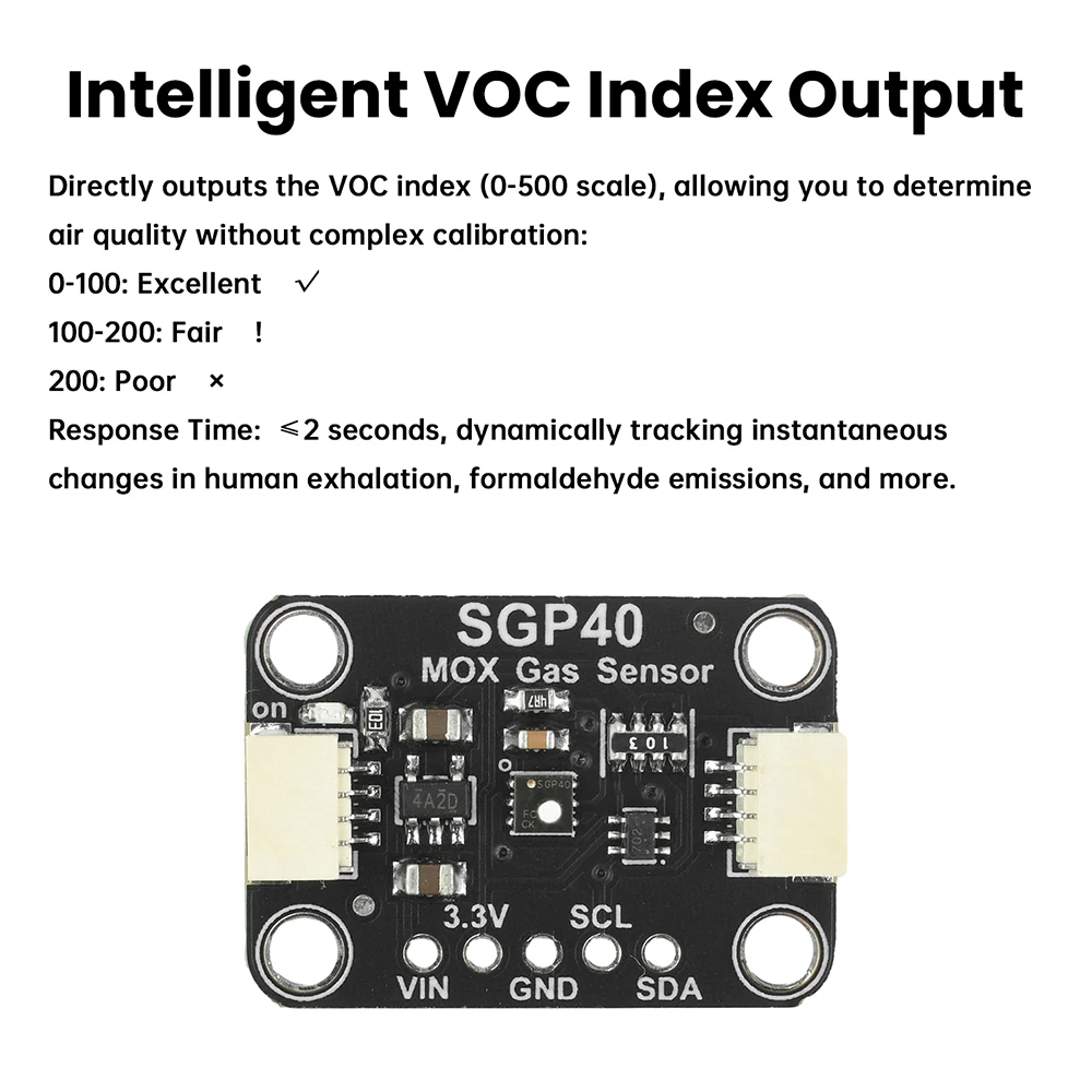 Directly output VOC Index (0-500 scale) to determine air quality without complex calibration: