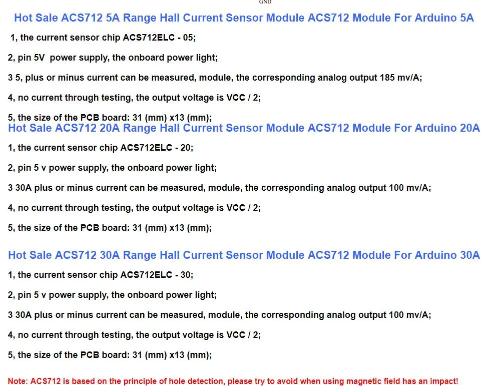 Módulo de Sensor de corriente Hall de rango ACS712 5A 20A 30A para Arduino ACS712-30A ACS712-20A ACS712-5A
