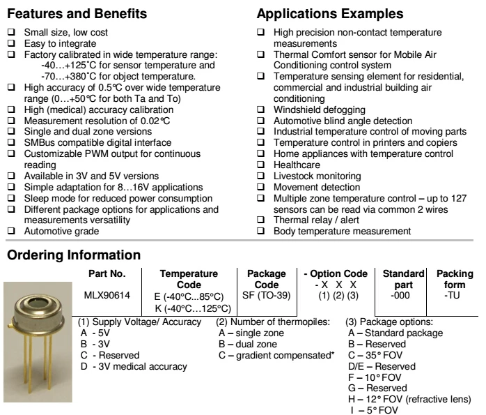 Precauciones:Es necesario prestar atención a la precisión mencionada anteriormente en el diseño de aplicaciones que se puede garantizar y lograr cuando el sensor está bajo equilibrio térmico y condiciones isotérmicas.(No hay diferencia de temperatura en el paquete del sensor) La diferencia de temperatura dentro del paquete afectará la precisión de la medición del termómetro.Los siguientes factores causarán la diferencia de temperatura: la trmiónica en la parte posterior del sensor, el calentador/enfriador en la parte posterior o al lado del sensor, o cuando un objeto frío/caliente se acercará al sensor, no solo se calentará el elemento sensor., pero también el paquete del termómetro.Es necesario evitar el uso de operaciones que provocan gradientes térmicos o aislar el sensor del medio ambiente tanto como sea posible.Modelo de chip: MLX90614-DCI