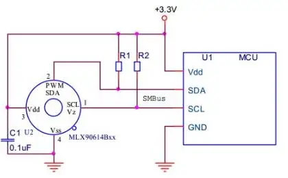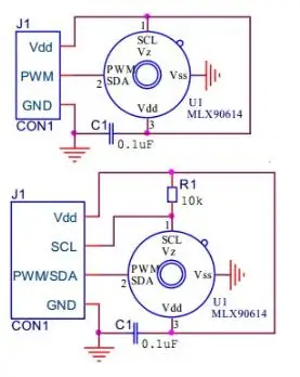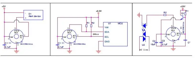 El MLX90614 se puede configurar como modo de funcionamiento de relé térmico en EEPROM.El pin PWM/SDA se puede configurar como NMOS push-pull o de drenaje abierto, que puede activar un dispositivo interno, como relé, zumbador, transmisor RF o LED.Esta característica no requiere ninguna MCU para realizar un termostato simple y no hay costo para el desarrollo de firmware.Combinada con MCU, esta función se puede utilizar como alarma del sistema para activar la MCU.Tanto la temperatura del objeto como la temperatura del chip del sensor se pueden leer a través de esta configuración.