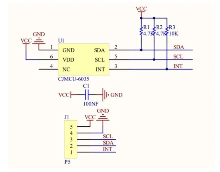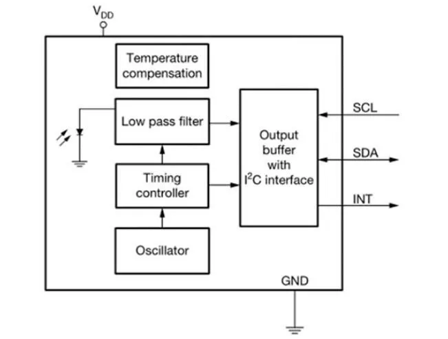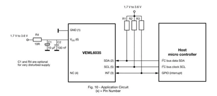 Circuito de aplicación típicoVEML6035 tiene una dirección esclava fija para programación del host y selección de acceso. La dirección del bus I2C predefinida de 7 bits está configurada en 0100001=0x29. El bit menos significativo (LSB) define el modo de lectura o escritura. En consecuencia, la dirección del bus se establece en 01010010=52 h cuando se escribe y 01010011=53 h cuando se lee. La interfaz IIC del módulo tiene una resistencia pull-up, por lo que el usuario no necesita levantarla nuevamente.