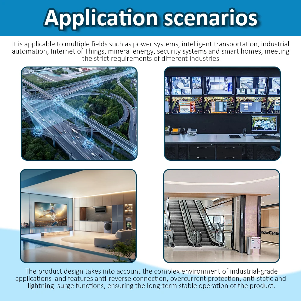 Este producto funciona con CC de amplio voltaje, con un voltaje nominal de CC de 12 V-24 V.La corriente nominal es inferior a 0,1 A y la potencia es inferior a 1 vatio.Los clientes generalmente utilizan fuentes de alimentación de 12 V o 24 V CC.En escenarios con líneas de alimentación largas, teniendo en cuenta la caída de voltaje en la línea, se recomienda utilizar una fuente de alimentación de 24 V CC.