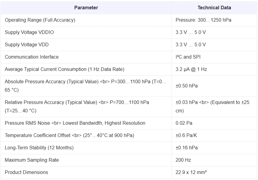 Este sensor mantiene la estabilidad a altas temperaturas en todo el rango de temperatura de funcionamiento y en todo el rango de presión de 0 a 65 ° C y 700 a 1100 hPa, con un compensación de coeficiente de temperatura promedio (TCO) de sólo ±0,6 Pa/K. El ruido también es muy bajo, normalmente sólo 0,9 Pa, que es un 25% menor que el del BMP380 anterior. Este dispositivo también tiene una estabilidad relativamente alta.