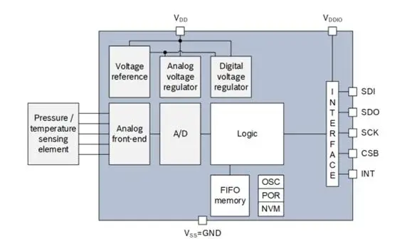 Consumo de corriente: 3,4 microamperios a 1 Hz de presión y temperatura, 2,0 microamperios en modo de suspensión