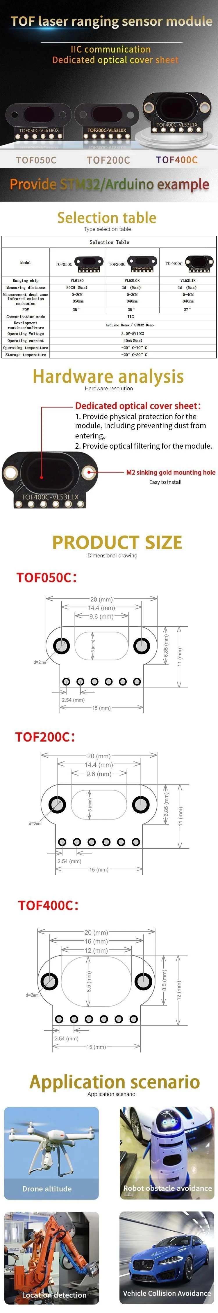 Módulo de Sensor de rango láser TOF050C 200C 400C distancia de tiempo de vuelo TOF salida IIC para Arduino VL6180 VL53L0X VL53L1X
