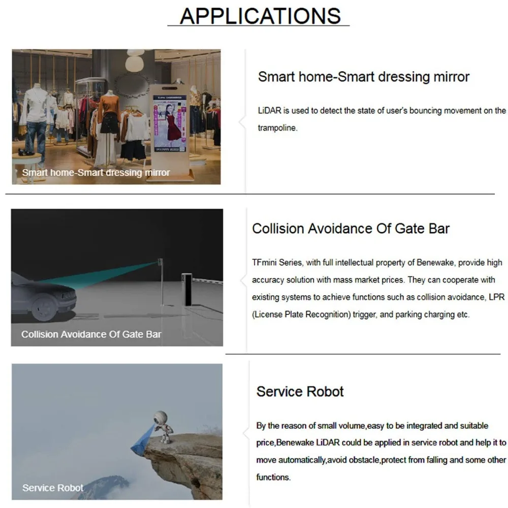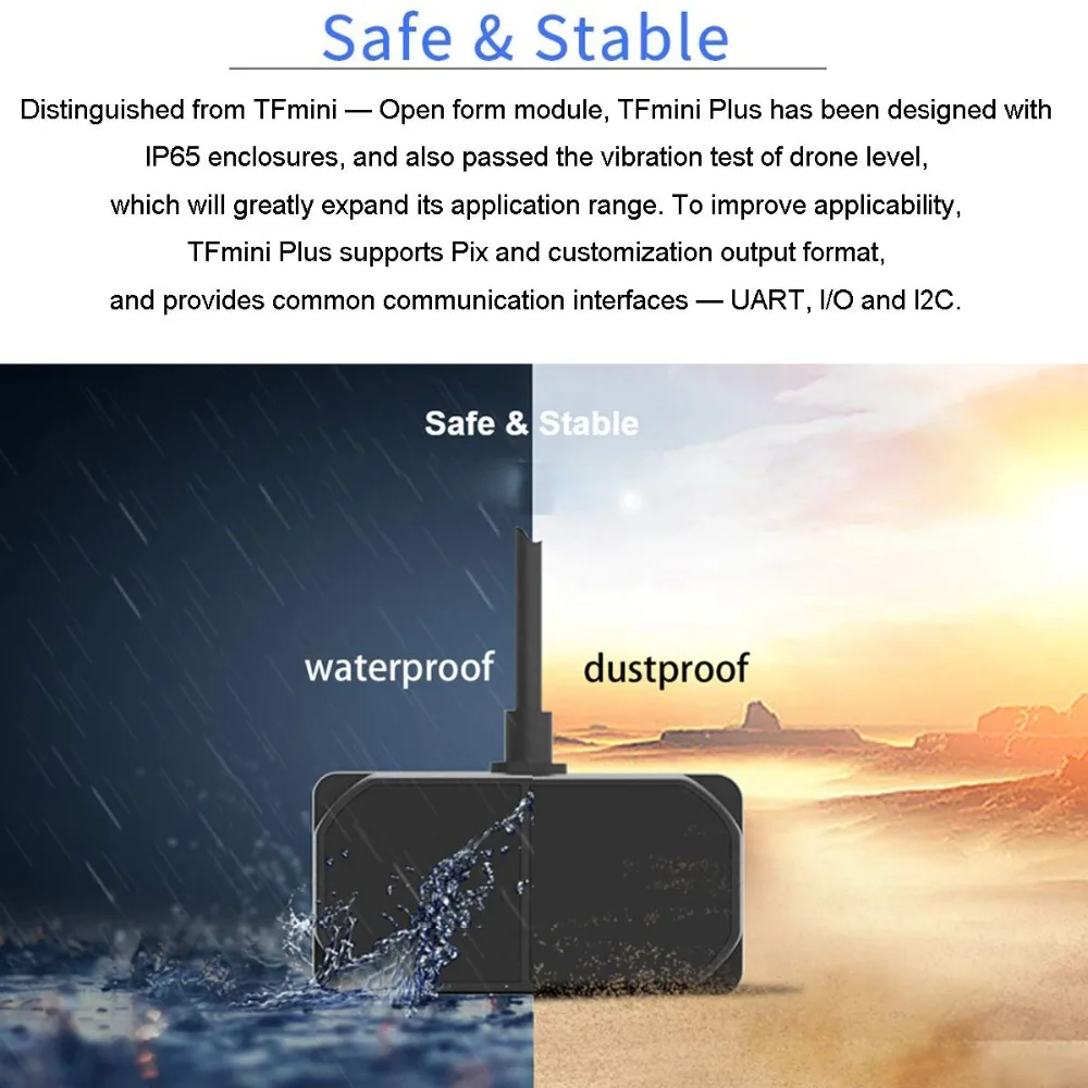 TFmini Plus is an upgraded product based on TFmini, based on the TOF (time of flight) principle, combined with unique optical, electrical, and algorithm design, mainly to achieve stable, accurate, high sensitivity and high-speed distance measurement functions. In addition to the low cost, small size, and low power consumption of TFmini, the product itself also adds IP65 protection, which is more adaptable to different environments such as strong outdoor light, different temperatures, and different reflectances.Product parameters:Accuracy: ±5cm@(0.1-6m)/±1% @ (6m-12m)Measuring range: 0.1m ~ 12mDistance resolution: 5mmFrame rate: 1-1000Hz (adjustable)Ambient light resistance: 70kluxWorking temperature: -20 ℃ ~ 60 ℃Protection level: IP65Light source: LEDCenter wavelength: 850nmSignal receiving angle: 3.6 °Input voltage: 5V ± 0.5VAverage current: ≤110mAPower consumption: 550mWPeak current: 500mACommunication level: LVTTL (3.3V)Shell material: ABS + PCStorage temperature: -20 ℃ ~ 75 ℃