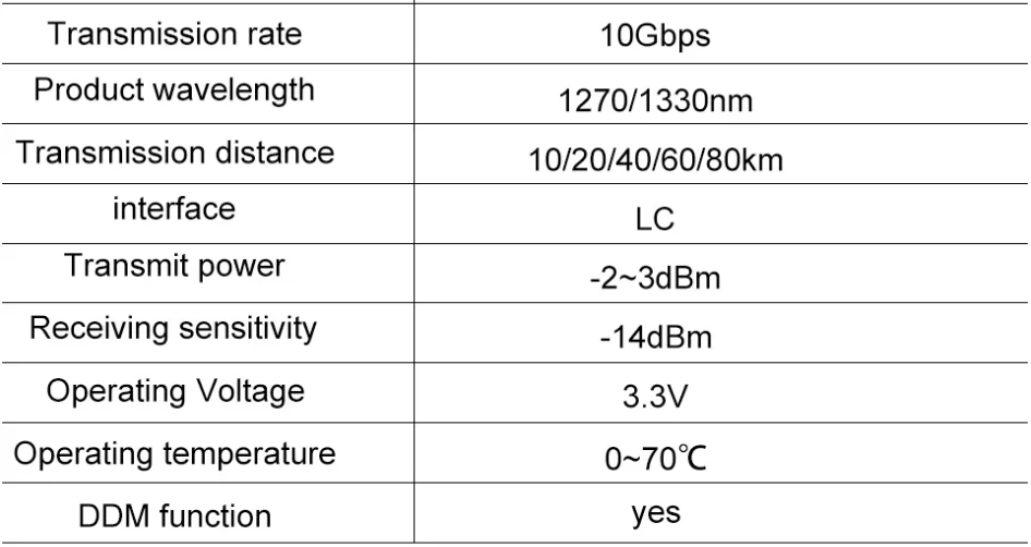 ●Supports 9.95 to 10.3Gb/s bit rates●Simplex LC Connector●Hot pluggable SFP+ footprint●Uncooled 1310nm LD transmitter, 1310nm PIN photo-detector●Applicable for 3km SMF connection●Low power consumption, 1.0W●Digital Diagnostic Monitor Interface●Optical interface compliant to IEEE 802.3ae 10GBASE-LR●Electrical interface compliant to SFF-8431●Operating case temperature: Commerical:0 to 70 °CApplications