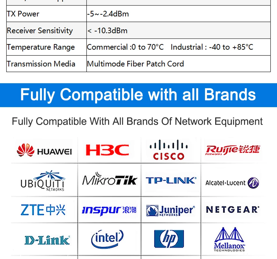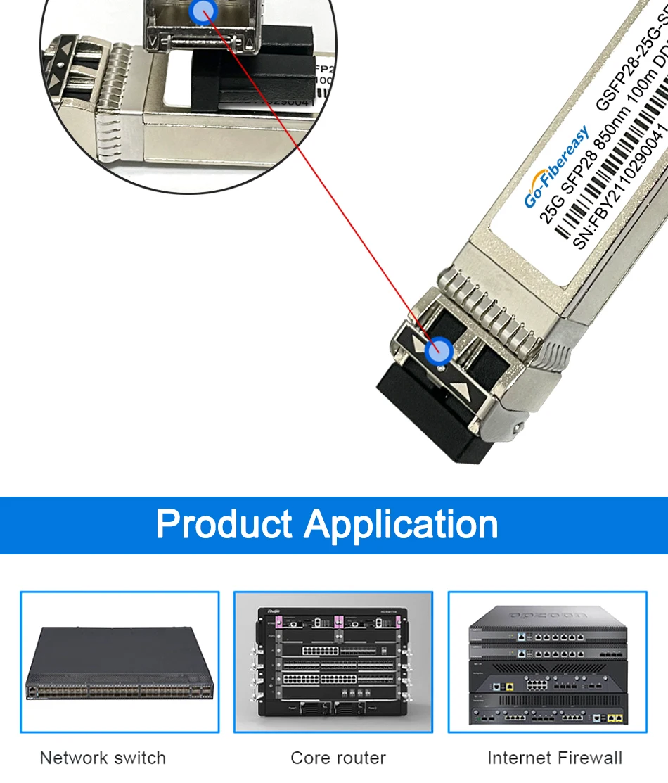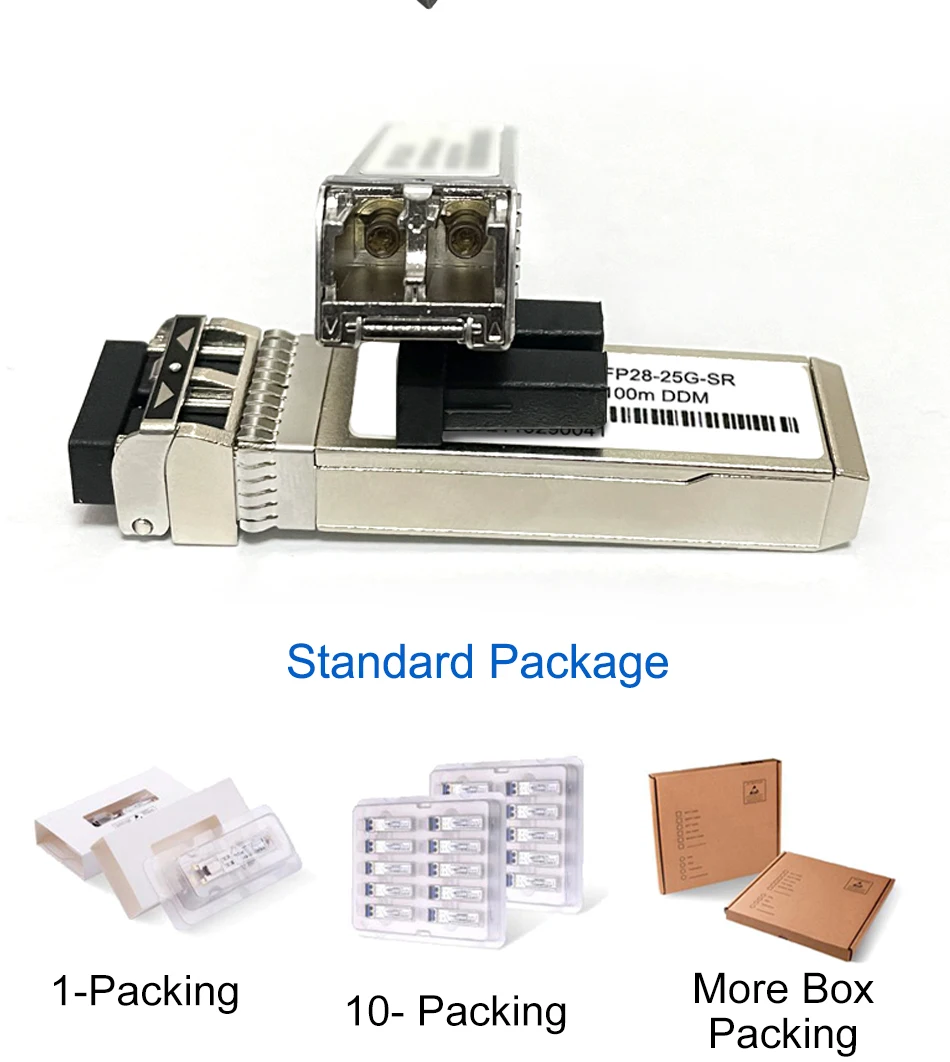 El transceptor SFP28 compatible con Cisco 100 Adopta conectores dúplex LC, alcanzando un enlace de hasta m sobre OM4 MMF (70m sobre OM3). El módulo transceptor SFP28 admite la ejecución en la misma infraestructura de cableado de red 1G/10G, lo que aumenta al menos 2,5 veces la velocidad, Y las funciones DDM/DOM integradas supervisan el estado de funcionamiento en tiempo real. Cada módulo transceptor SFP28 se prueba individualmente en una serie de interruptores Cisco y cumple totalmente con los estándares SFP28 MSA, RoHS, CPRI y eCPRI. Con bajo consumo de energía y alta velocidad, este transceptor 25G es ideal para Ethernet 25G, telecomunicaciones y centros de datos.