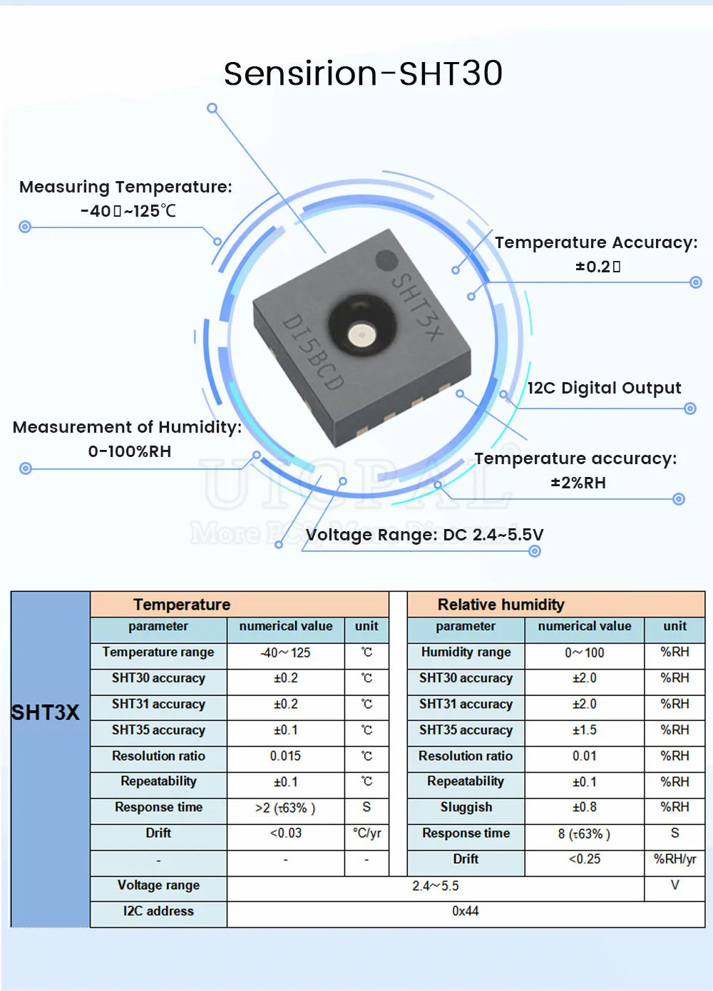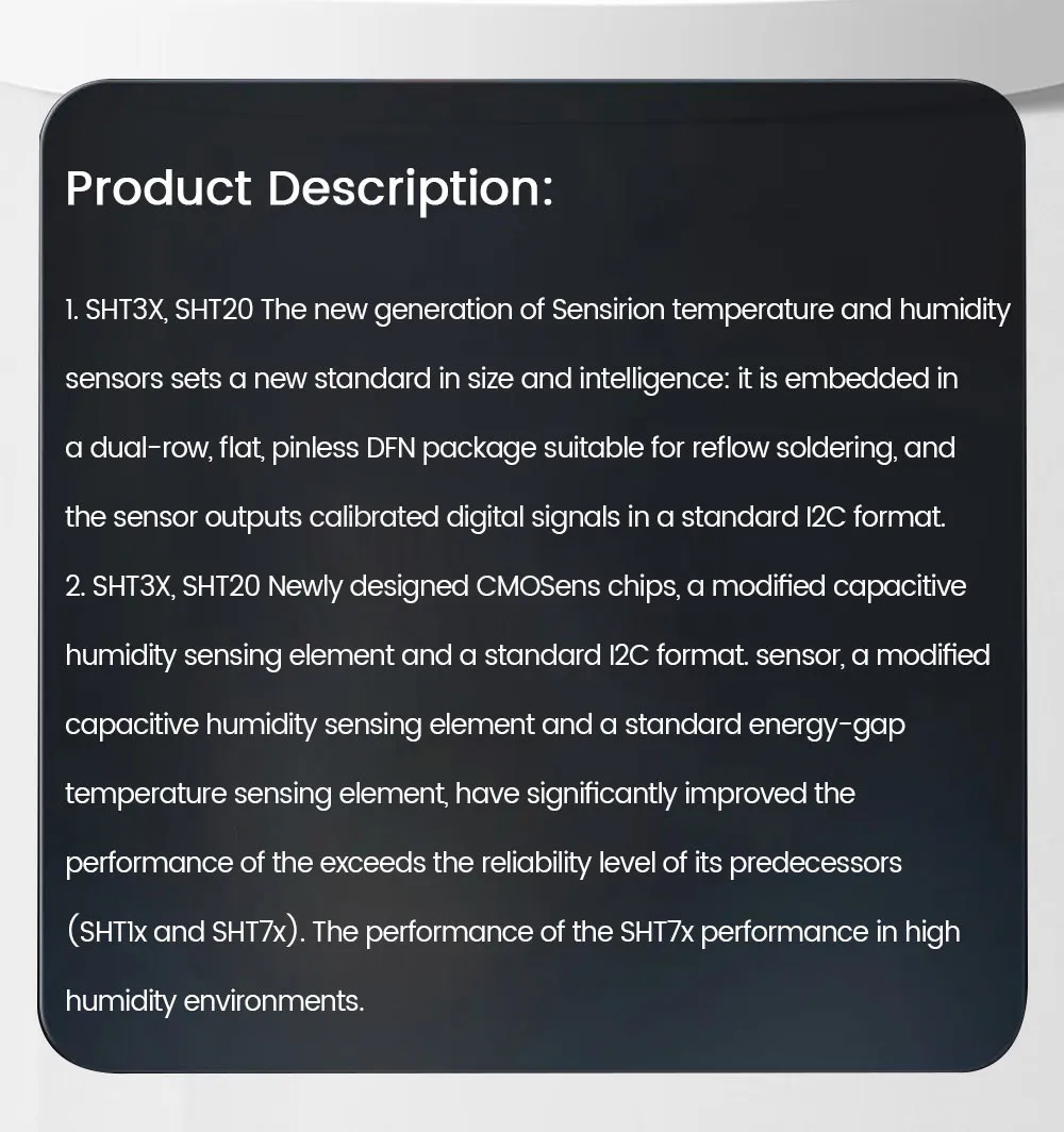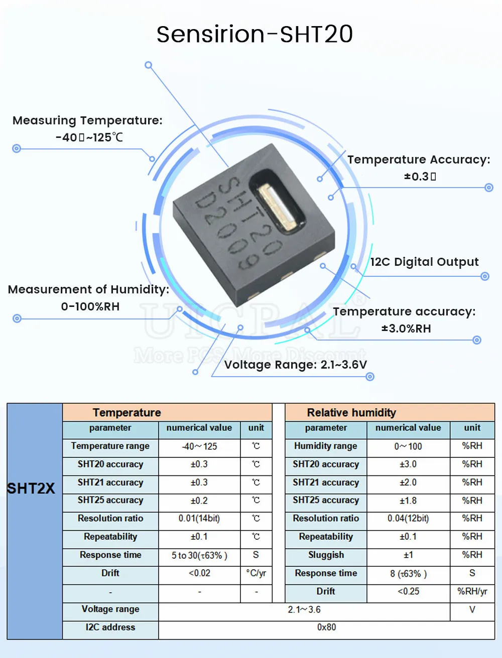 SHT20, una nueva generación de sensores de temperatura y humedad Sensirion establece un nuevo estándar en tamaño e inteligencia: está integrado en un paquete DFN plano sin plomo de doble fila adecuado para soldadura por reflujo, y el sensor emite una señal digital calibrada en formato I2C estándar.