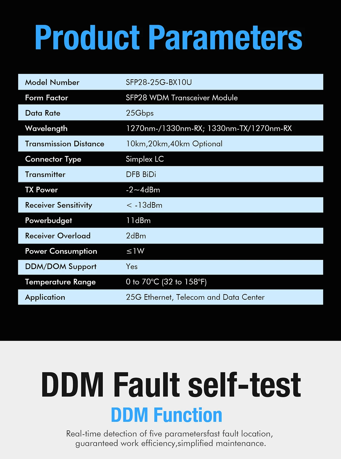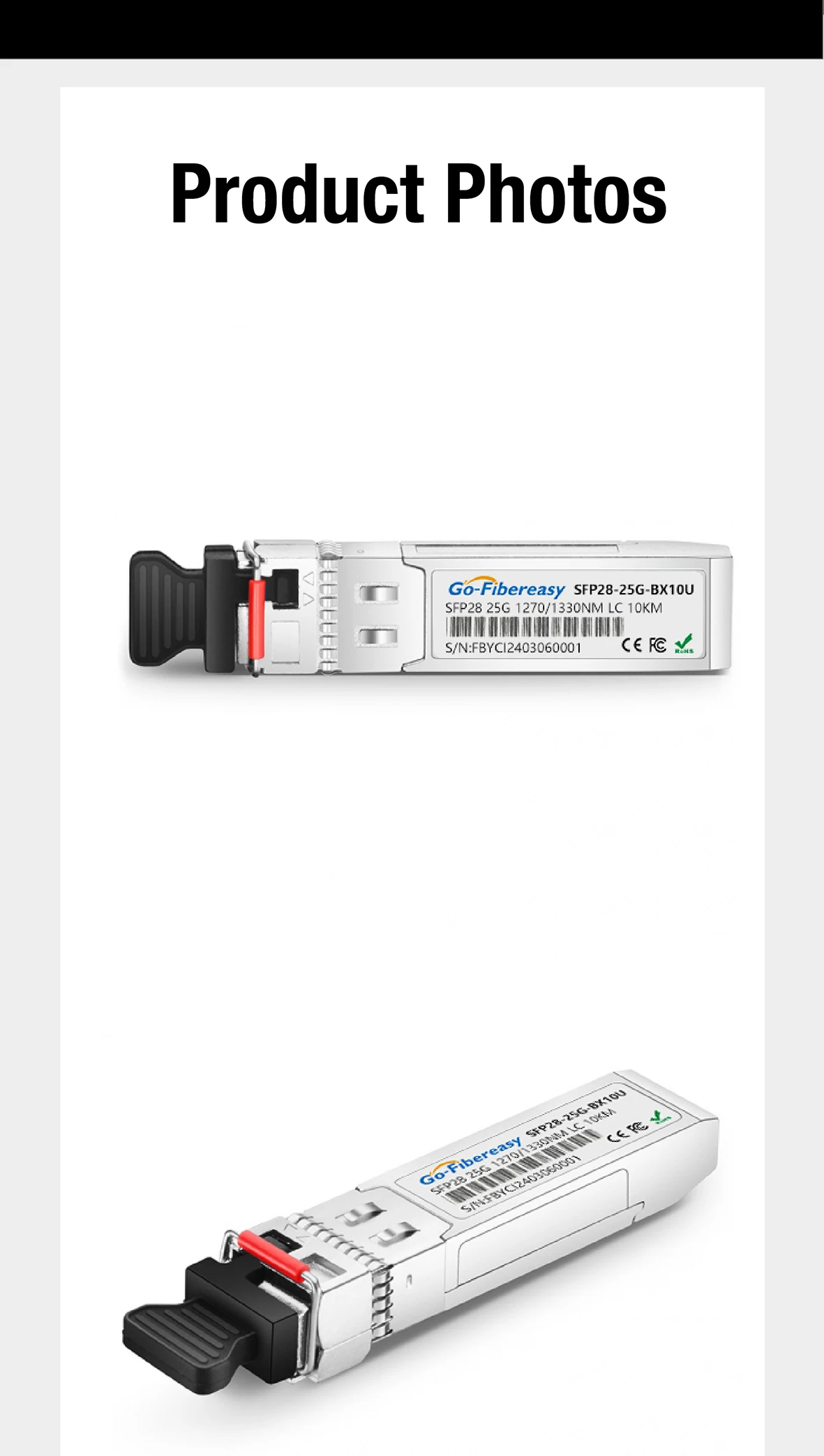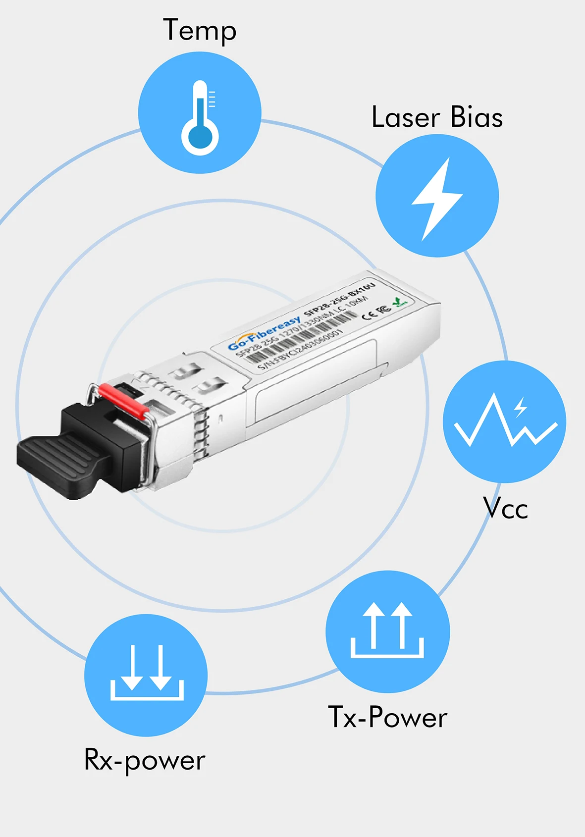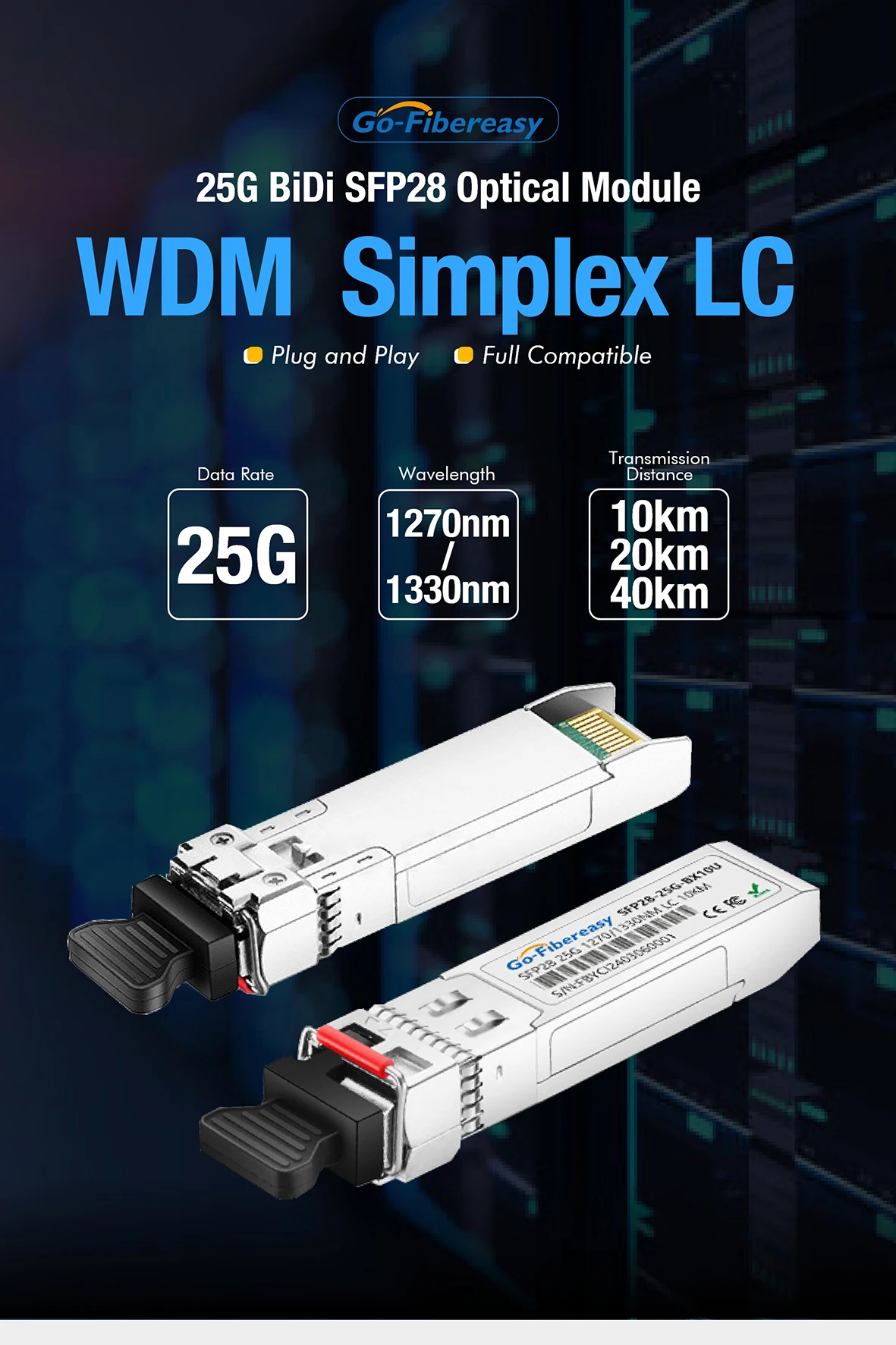 El transceptor SFP28 de Go-Fibereasy proporciona un rendimiento de 25 GBase-BX de hasta 10 km sobre fibra monomodo (SMF) utilizando una longitud de onda de 1330 nm-TX/1270 nm-RX a través de un conector LC simplex. Esta unidad bidireccional debe usarse con otro transceptor o dispositivo de red de longitudes de onda complementarias. Proporciona una opción de conectividad Ethernet de 25 GBASE para Ethernet de 25 G, telecomunicaciones y centros de datos. Cumple totalmente con los estándares SFP28 MSA, CPRI y eCPRI.