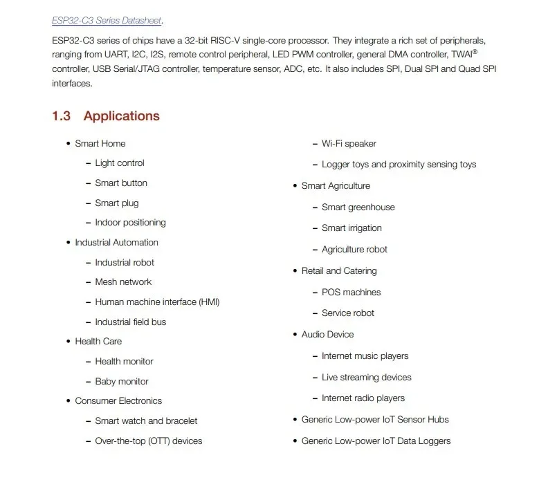 ESP32-C3-MINI-1-N4 es un módulo muy adecuado para aplicaciones de IoT.Tiene bajo consumo de energía, fácil de usar y características asequibles.ESP32-C3-MINI-1-N4 se puede utilizar en una variedad de aplicaciones de IoT, incluidos hogares inteligentes, automatización industrial y dispositivos portátiles.