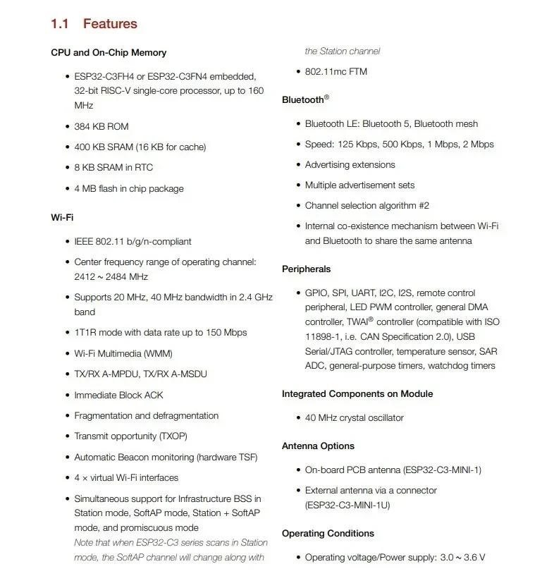 ESP32-C3-MINI-1-N4 es un módulo Wi-Fi y Bluetooth basado en el último microcontrolador ESP32-C3 de Espressif.Tiene 4 MB de memoria Flash, 256 KB de RAM y una frecuencia de reloj de CPU de 160 MHz.ESP32-C3-MINI-1-N4 también tiene un amplio conjunto de interfaces de E/S, que incluyen 18 GPIO, 3 UART, 2 SPIs, 2 I2C y 1 CAN.