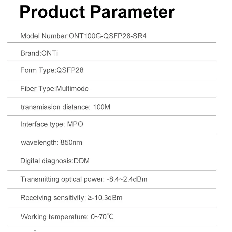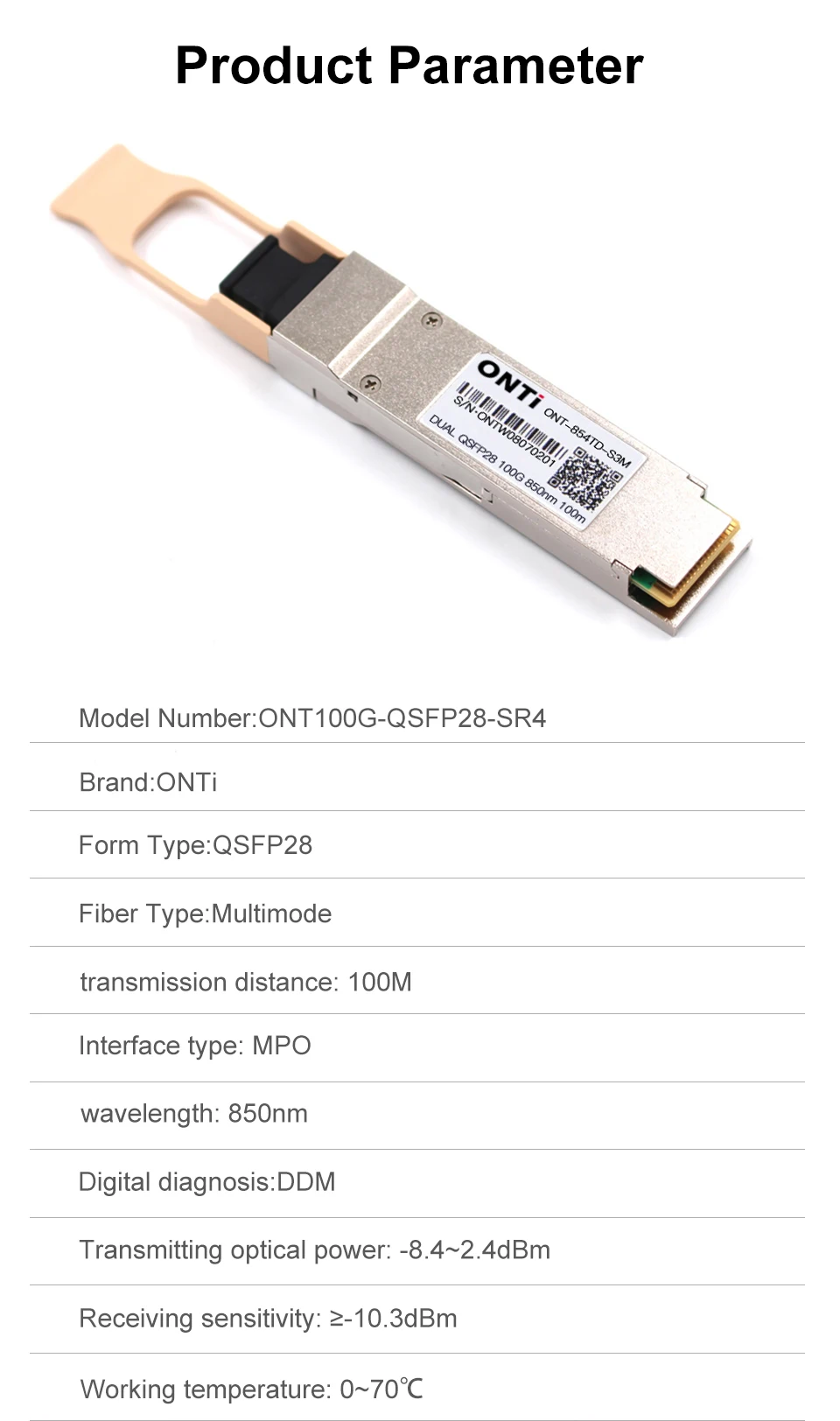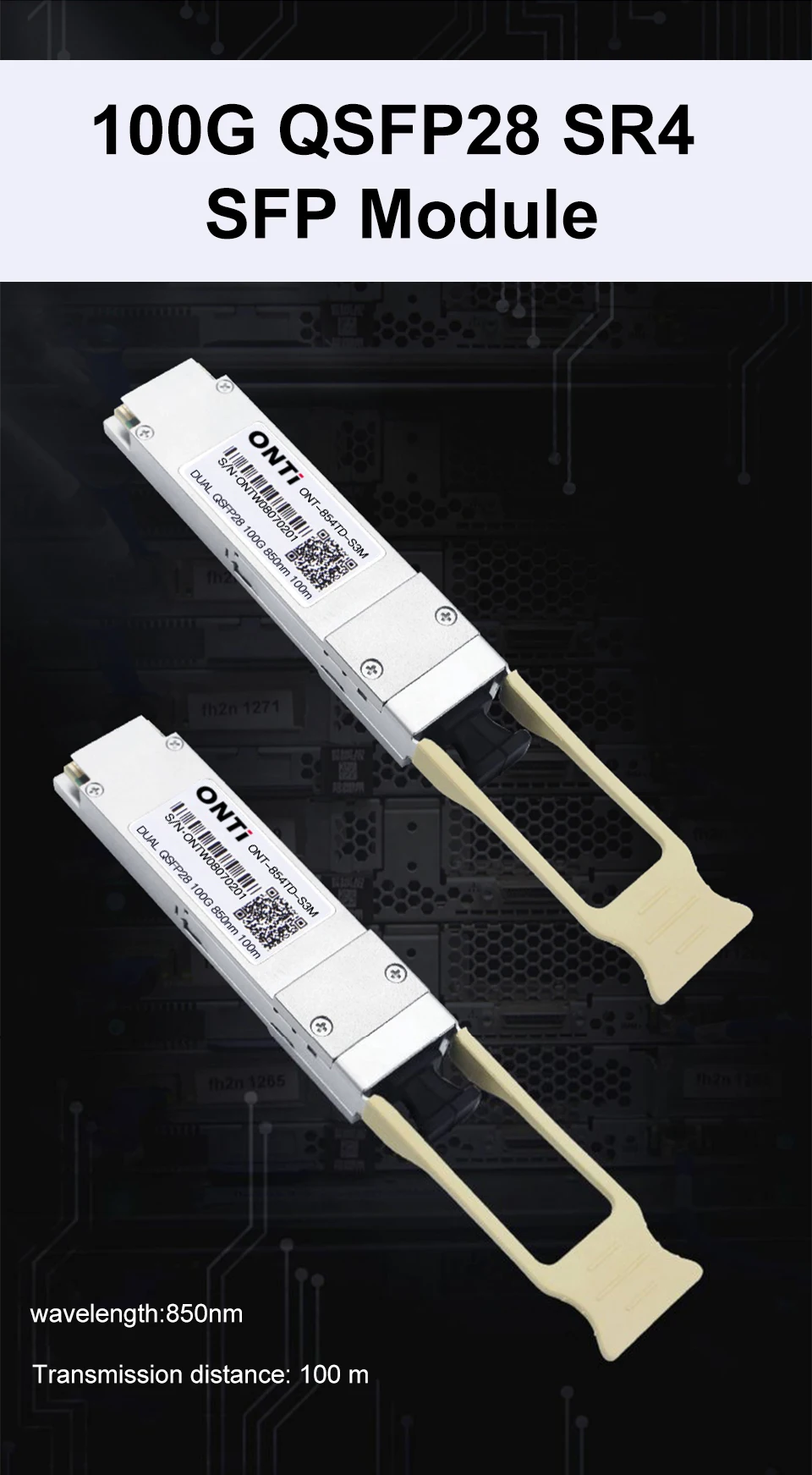 Módulo transceptor ONTi 100G QSFP28 100GBASE-SR4 QSFP28, de 850nm, 100m, MTP/MPO, DDM, compatible con varios modelos: bluetooth, mitrotik, HP,Intel, etc.