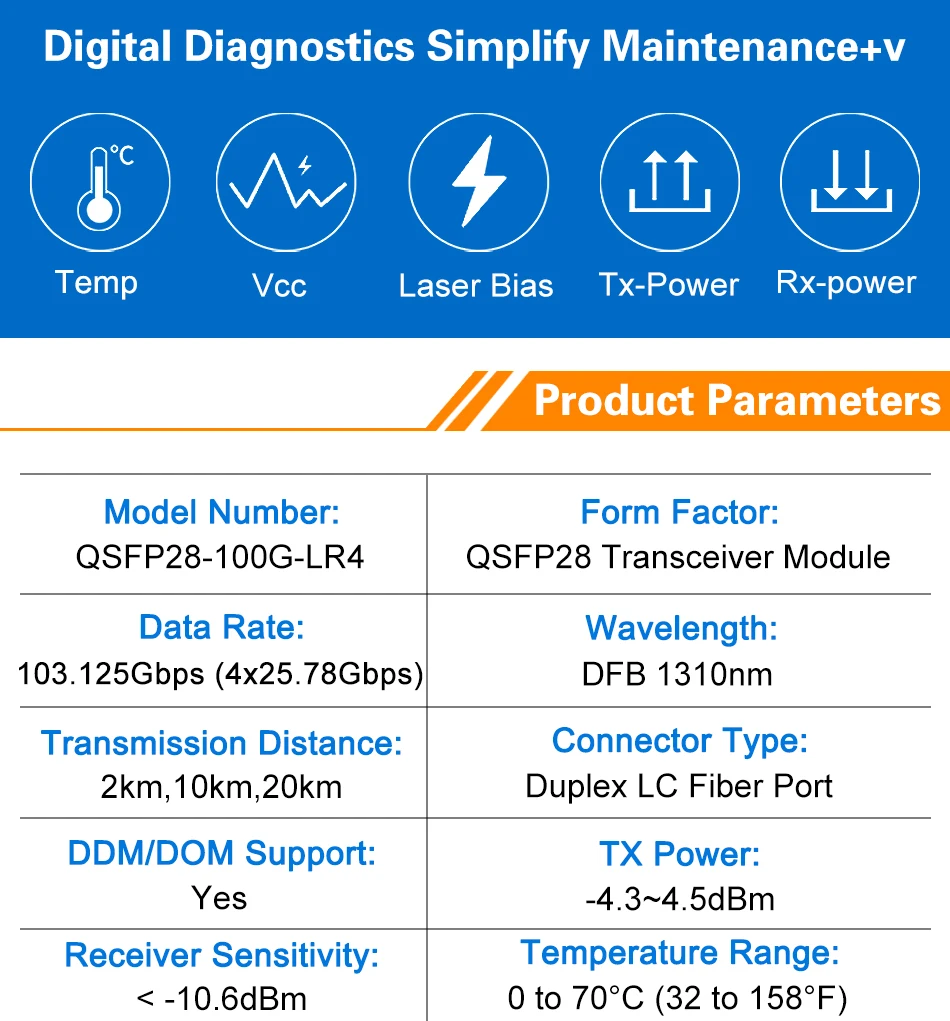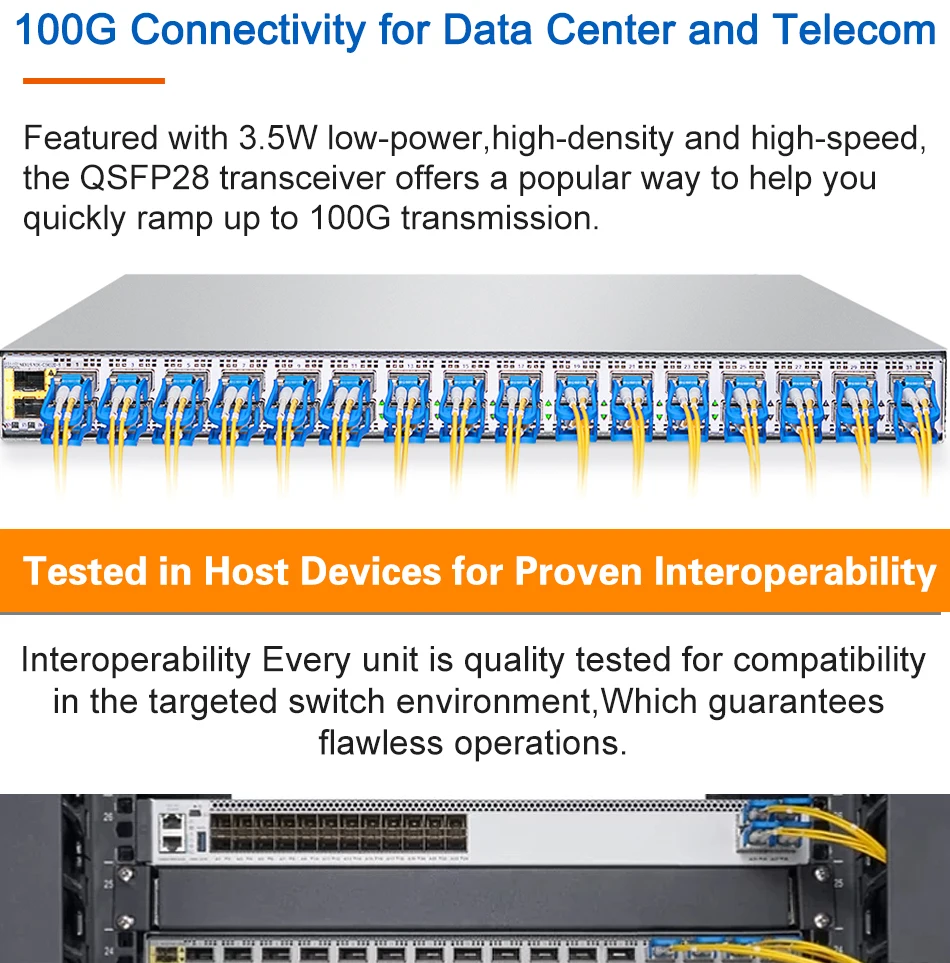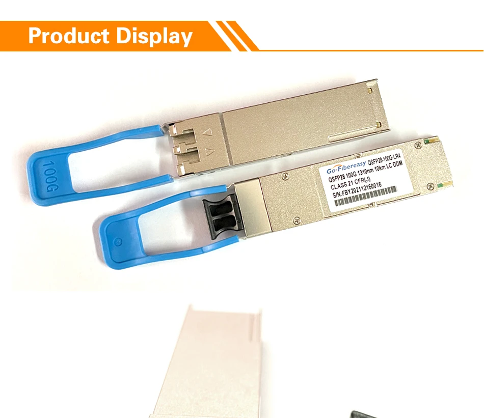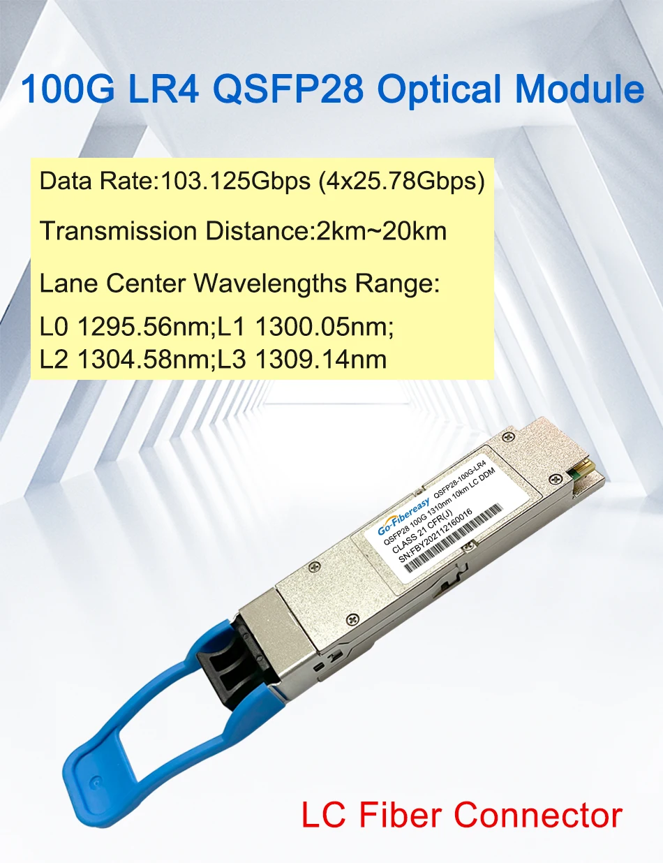 Módulo transceptor Go-Fibereasy QSFP28 100G LR4 Duplex LC SMF100GBASE-LR4Módulo óptico 1310nm 2km,10km para interruptor de fibra Huawei/Mikrotik/Juniper/Intel100GBASE-LR4 10KM QSFP28 1310nm LWDM4 2 ~ 10km Módulo transceptor QSFP para centro de datosCaracterísticas del producto1. Interfaz óptica de receptáculo LC dúplex2. Fuente de alimentación individual + 3,3 V3. Factor de forma QSFP28 MSA de conexión en calienteInterfaz serie eléctrica 4,4X25G