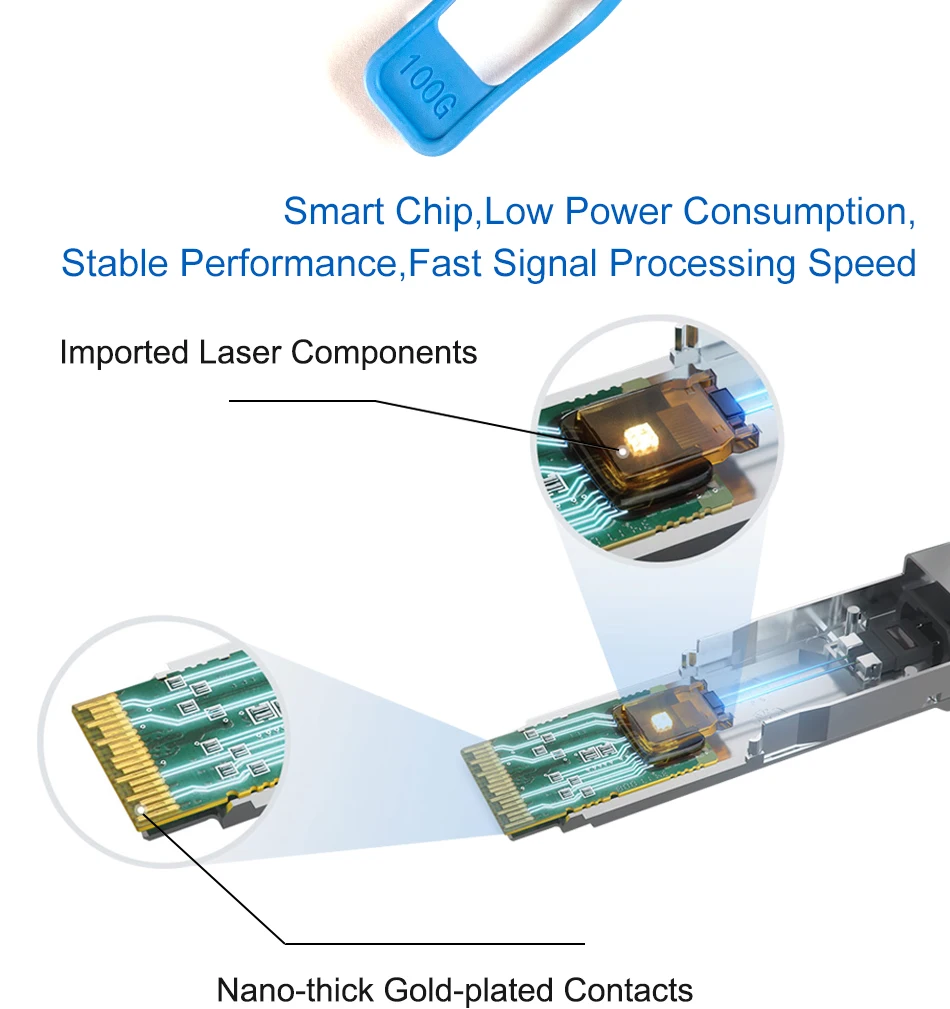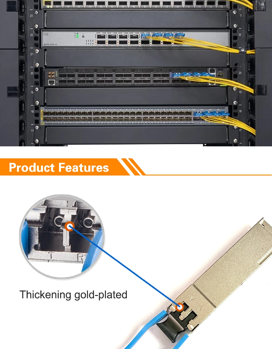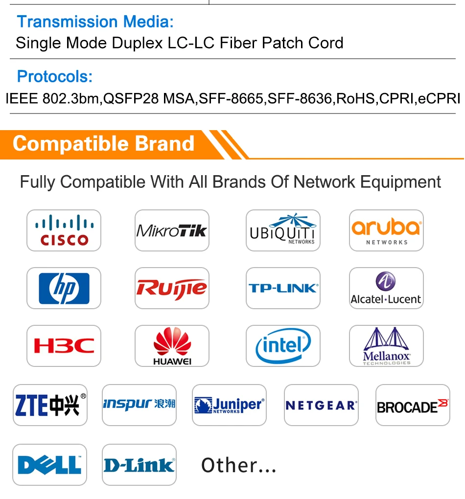 Módulo transceptor Go-Fibereasy QSFP28 100G LR4 Duplex LC SMF100GBASE-LR4Módulo óptico 1310nm 2km,10km para interruptor de fibra Huawei/Mikrotik/Juniper/Intel100GBASE-LR4 10KM QSFP28 1310nm LWDM4 2 ~ 10km Módulo transceptor QSFP para centro de datosCaracterísticas del producto1. Interfaz óptica de receptáculo LC dúplex2. Fuente de alimentación individual + 3,3 V3. Factor de forma QSFP28 MSA de conexión en calienteInterfaz serie eléctrica 4,4X25G