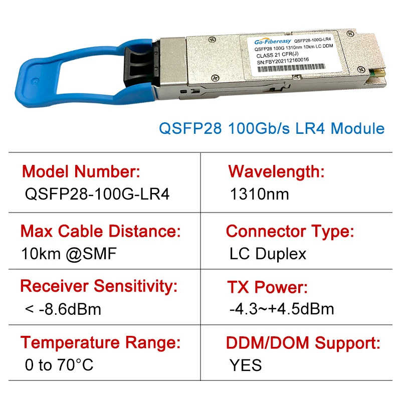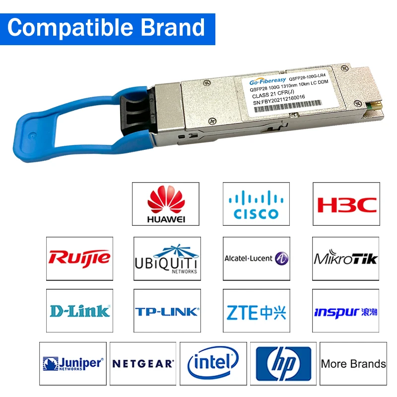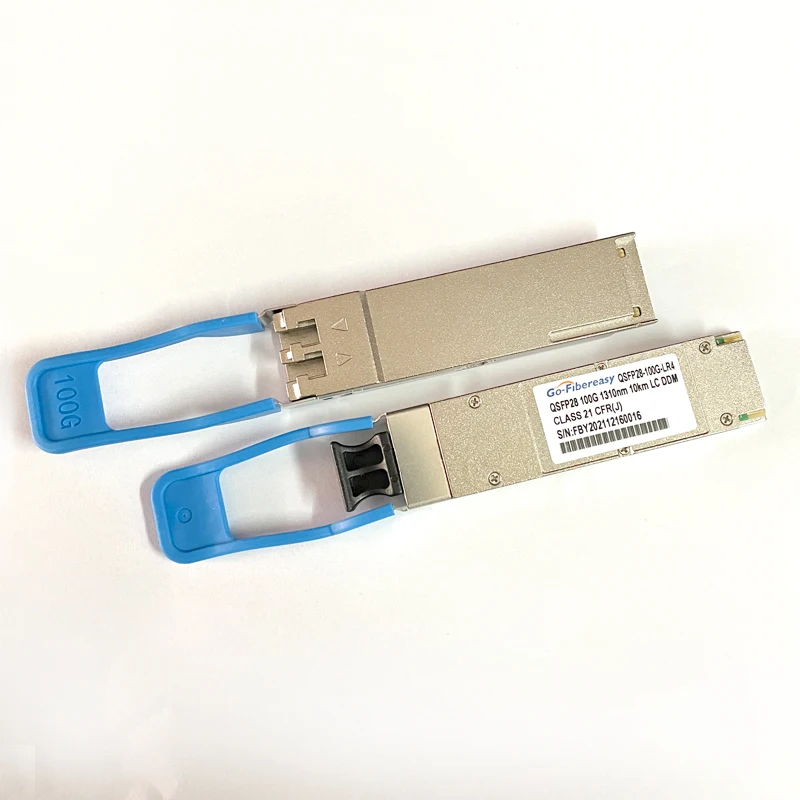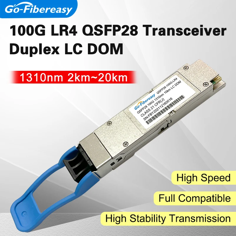 Módulo transceptor Go-Fibereasy QSFP28 100G LR4 Duplex LC SMF100GBASE-LR4Módulo óptico 1310nm 2km,10km para interruptor de fibra Huawei/Mikrotik/Juniper/Intel100GBASE-LR4 10KM QSFP28 1310nm LWDM4 2 ~ 10km Módulo transceptor QSFP para centro de datosCaracterísticas del producto1. Interfaz óptica de receptáculo LC dúplex2. Fuente de alimentación individual + 3,3 V3. Factor de forma QSFP28 MSA de conexión en calienteInterfaz serie eléctrica 4,4X25G