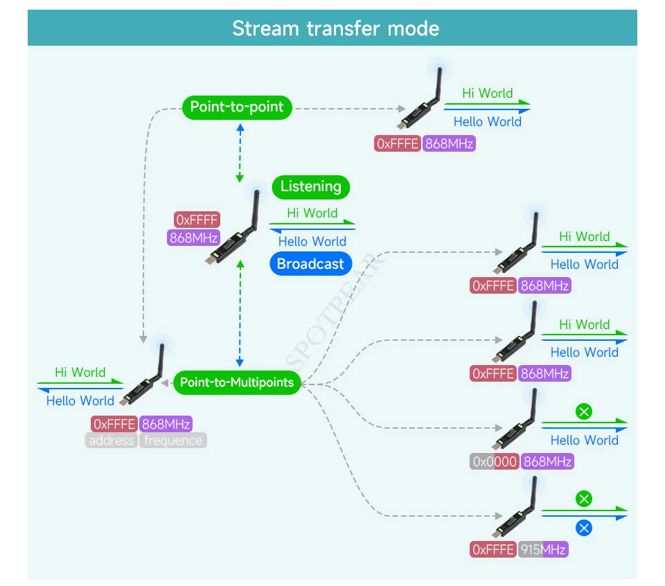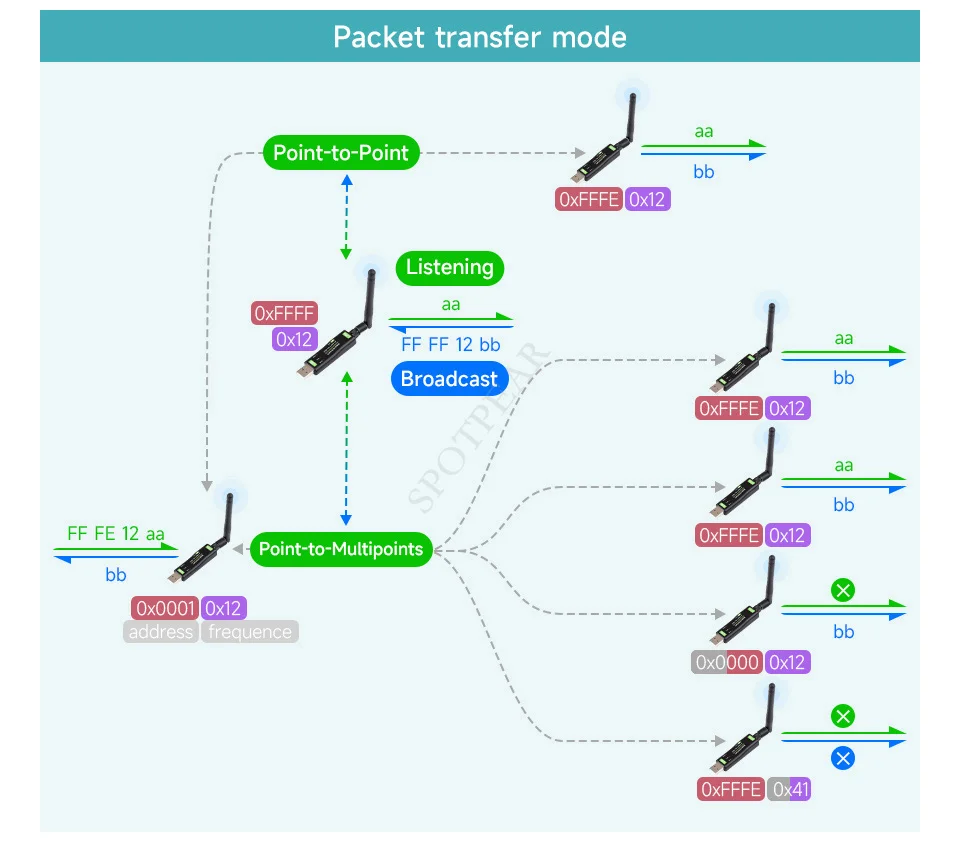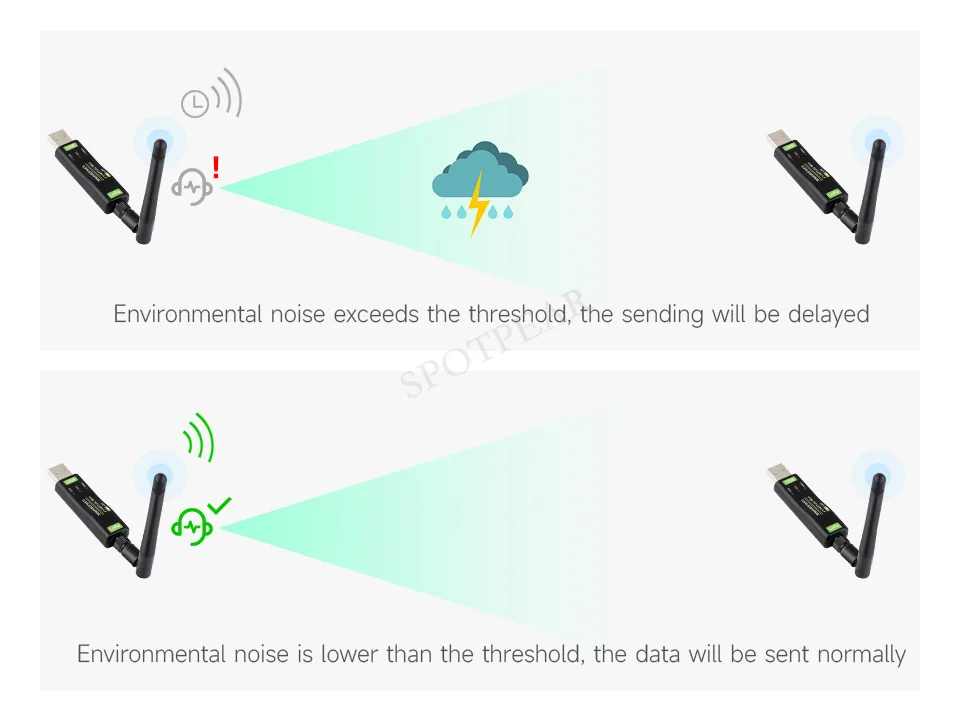 [] El módulo monitoreará activamente el ruido ambiental del canal antes de enviarlo. Si el ruido supera el umbral, el envío se retrasará. Esta función puede mejorar la tasa de éxito de la comunicación del módulo en entornos hostiles, adecuada para la transmisión en red y el procesamiento anticolisión
