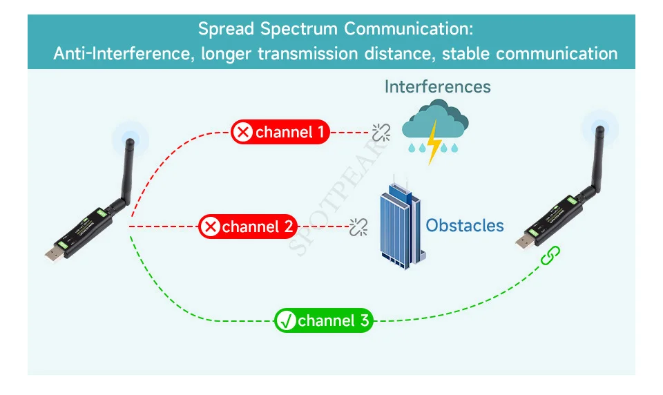 Las tecnologías de espectro (FHSS) mejoran en gran medida el rendimiento de la comunicación de largo alcance y la antiinterferencia,