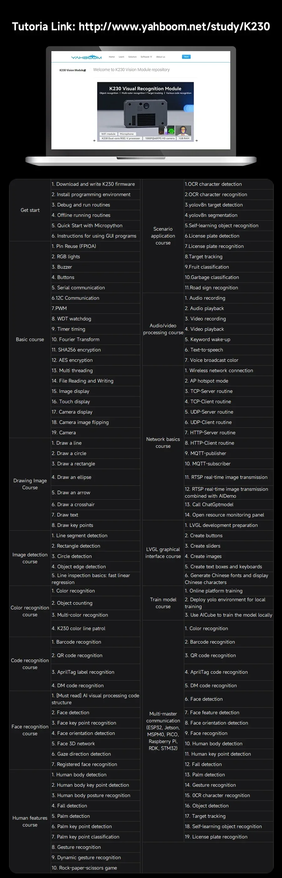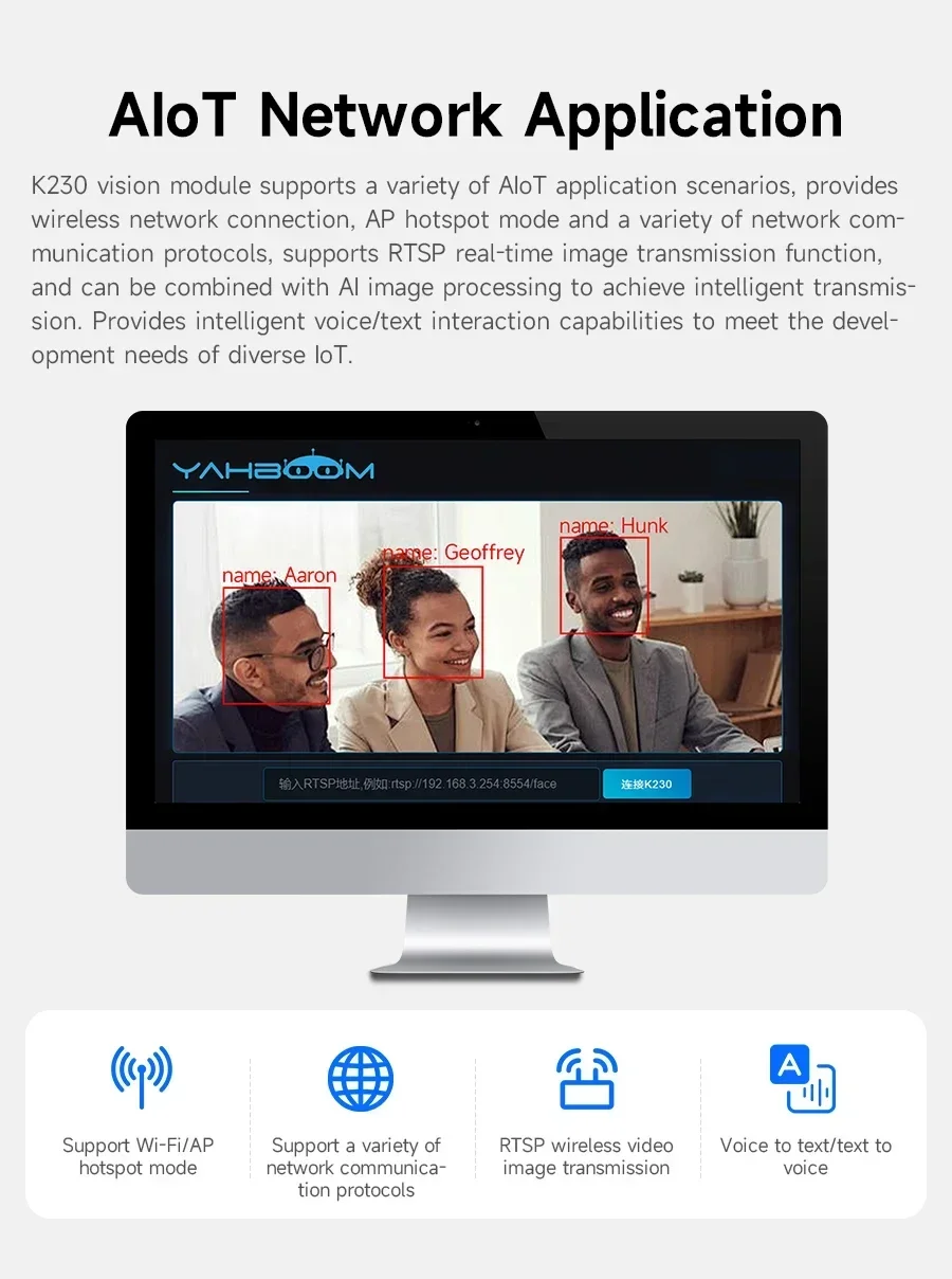 El módulo de visión Yahboom K230 es un módulo de procesamiento de visión AI integrado de alto rendimiento y bajo consumo diseñado para escenarios de computación de borde.Está diseñado en base al chip AloT del extremo de la arquitectura RISC-V, con potencia informática equivalente a 6 TOPS y 1 GB de RAM.Se puede conectar a una variedad de controladores principales como STM32, MSPM0, ESP32, Raspberry Pi, etc.a través de comunicación en serie.Equipado con un potente motor de aceleración de red neuronal, admite tareas de visión de IA como reconocimiento de imágenes en tiempo real, detección de objetivos, reconocimiento facial y análisis de comportamiento.Puede ser ampliamente utilizado en hogares inteligentes, educación criadora, robots de programación, competiciones de diseño electrónico y otras ocasiones.