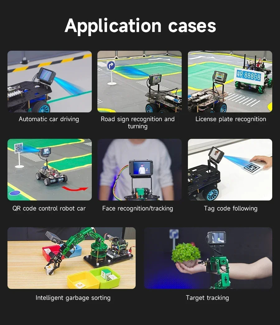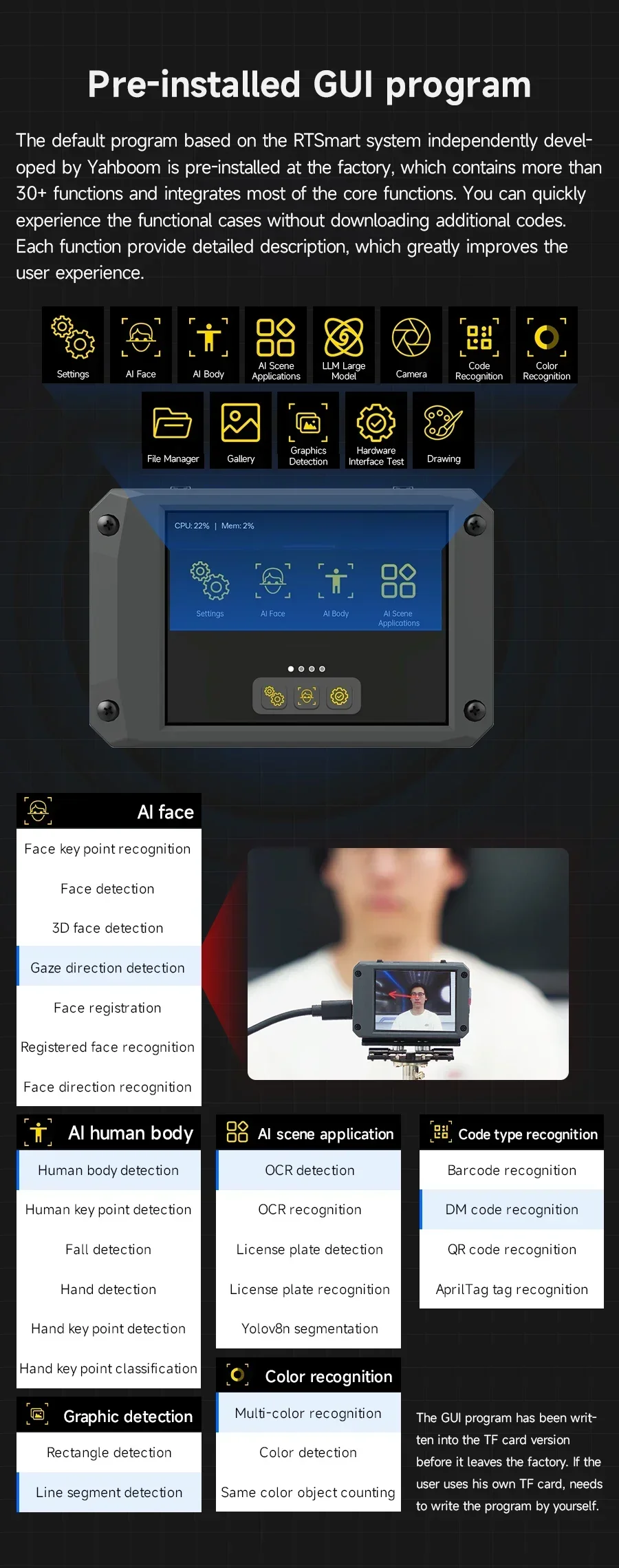 3.Programa GUI preinstalado, integrado con más de 30 funciones (reconocimiento de postura humana, reconocimiento de objetos, detección de imágenes, reconocimiento de señales de tráfico, luz de reconocimiento de códigos de etiquetas), los usuarios pueden experimentar rápidamente.