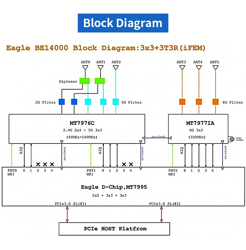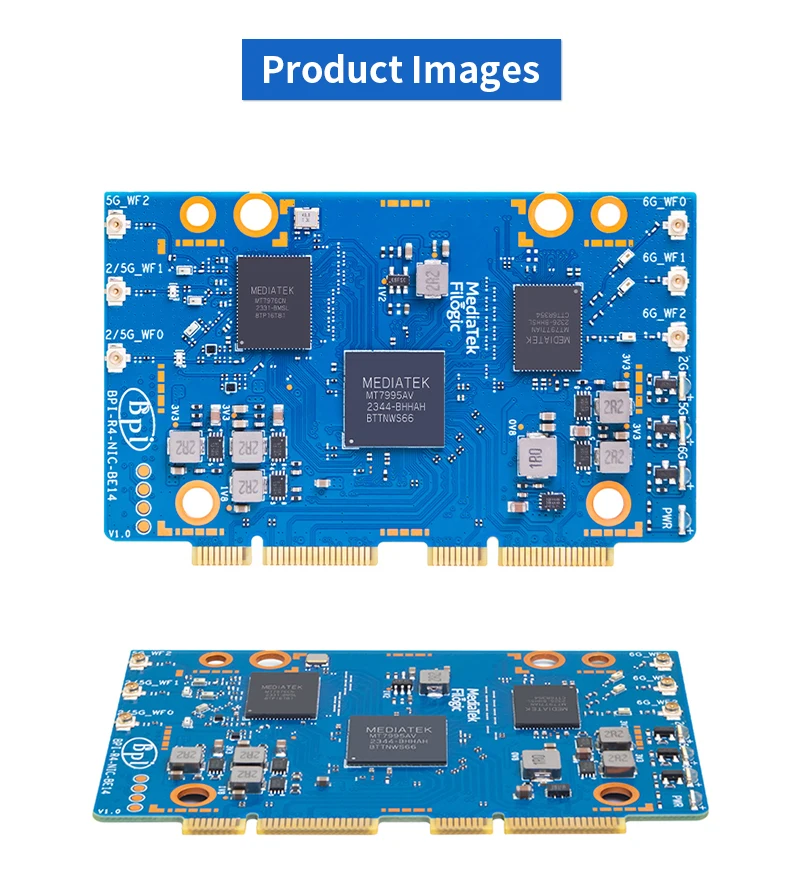 BPI-R4-NIC-BE14 is a 51x82mm WiFi7 module with MediaTek MT7995AV supports Wi-Fi7 technology and feature IEEE802.11a/b/g/n/ac/ax/be compliant,2.4GHz 2x2, 5GHz 3x3 3ss, and 6GHz 3x3 3ss BE13500 Wi-Fi subsystem. The MT7995AV offers feature-rich wireless connectivity at high standards and delivers reliable, cost-effective throughput from an extended distance.