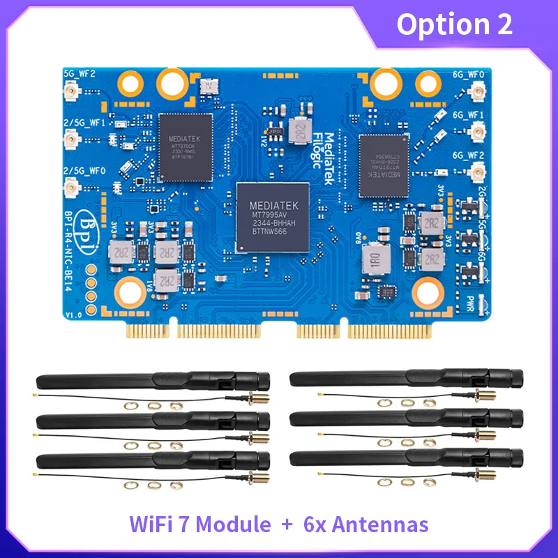 Comprar Módulo WiFi 7 BPI-R4-NIC-BE14 con antenas opcionales MediaTek MT7995AV interfaz RISC-V MCU 2 PCIe 3,0 de 32 bits para Banana Pi R4