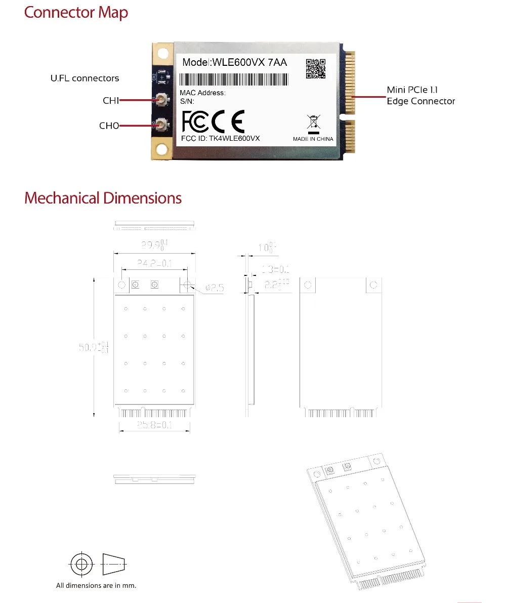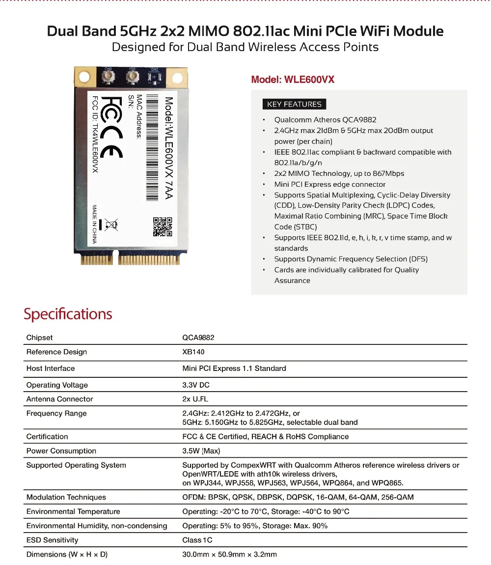 Comprar Módulo WIFI Compex WLE600VX de doble banda 2,4G 5G 802.11ac/abgn Mini PCI Express MIMO WIFI5 módulo Atheros QCA9882 Openwrt X86