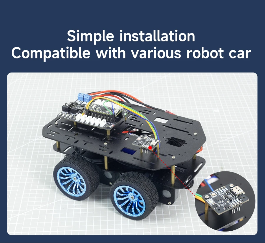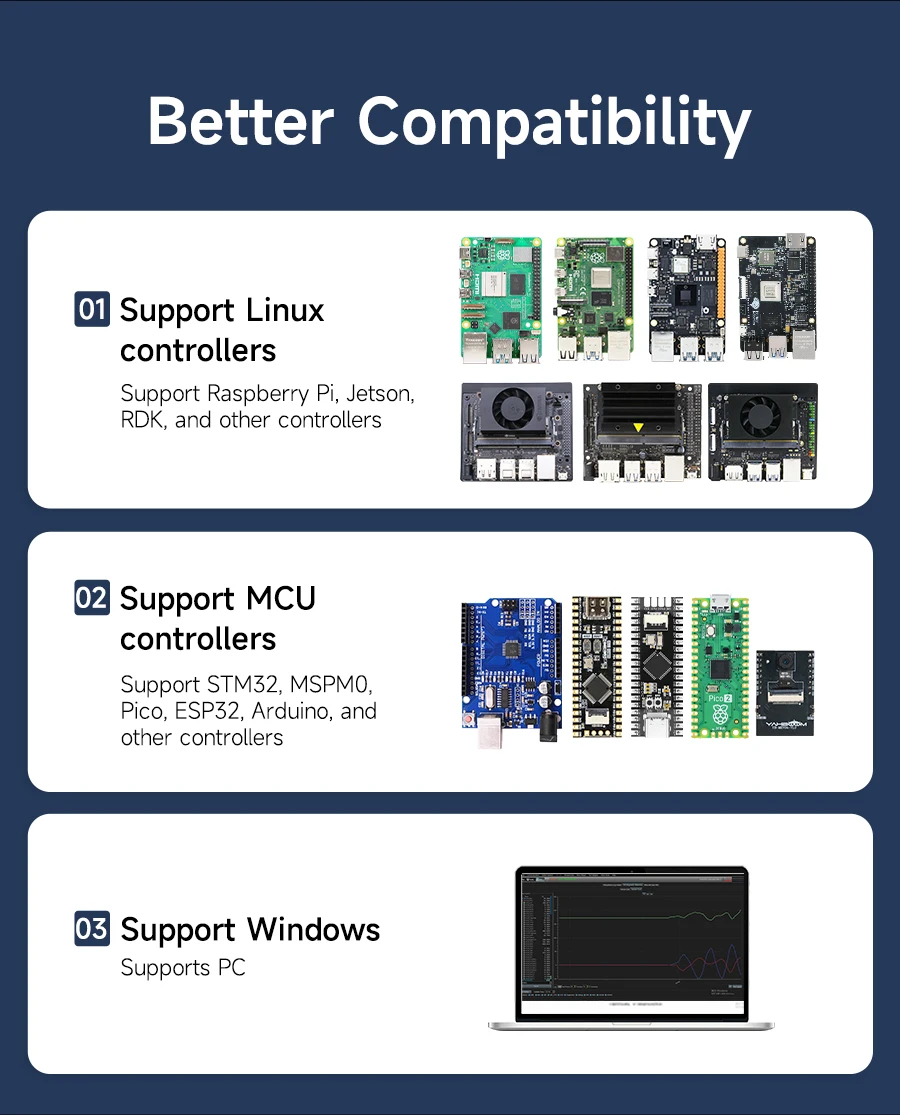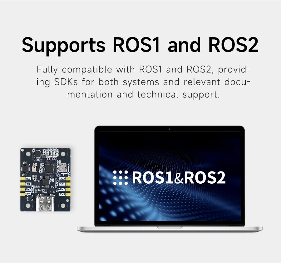 El módulo Yahboom IMU admite conexiones tipo C y con cabezal de clavija.Admite protocolos de comunicación IIC y UART y cuenta con un amplio voltaje de entrada de 3,3 V/5 V.Puede conectarse a una PC para depurar o trabajar con plataformas de desarrollo convencionales como Arduino, Raspberry Pi, STM32, ESP32, Jetson, RDK y MSPM0.