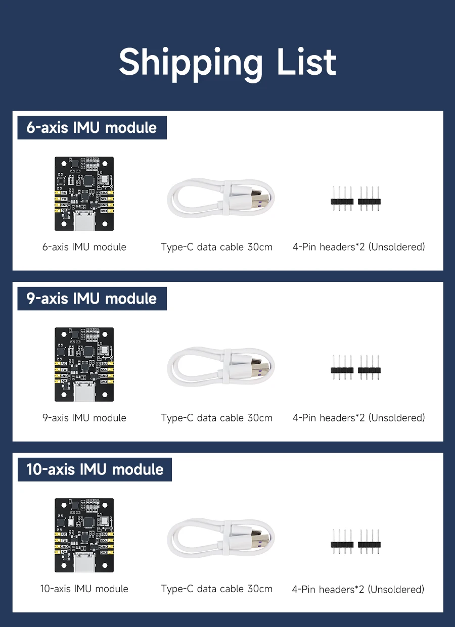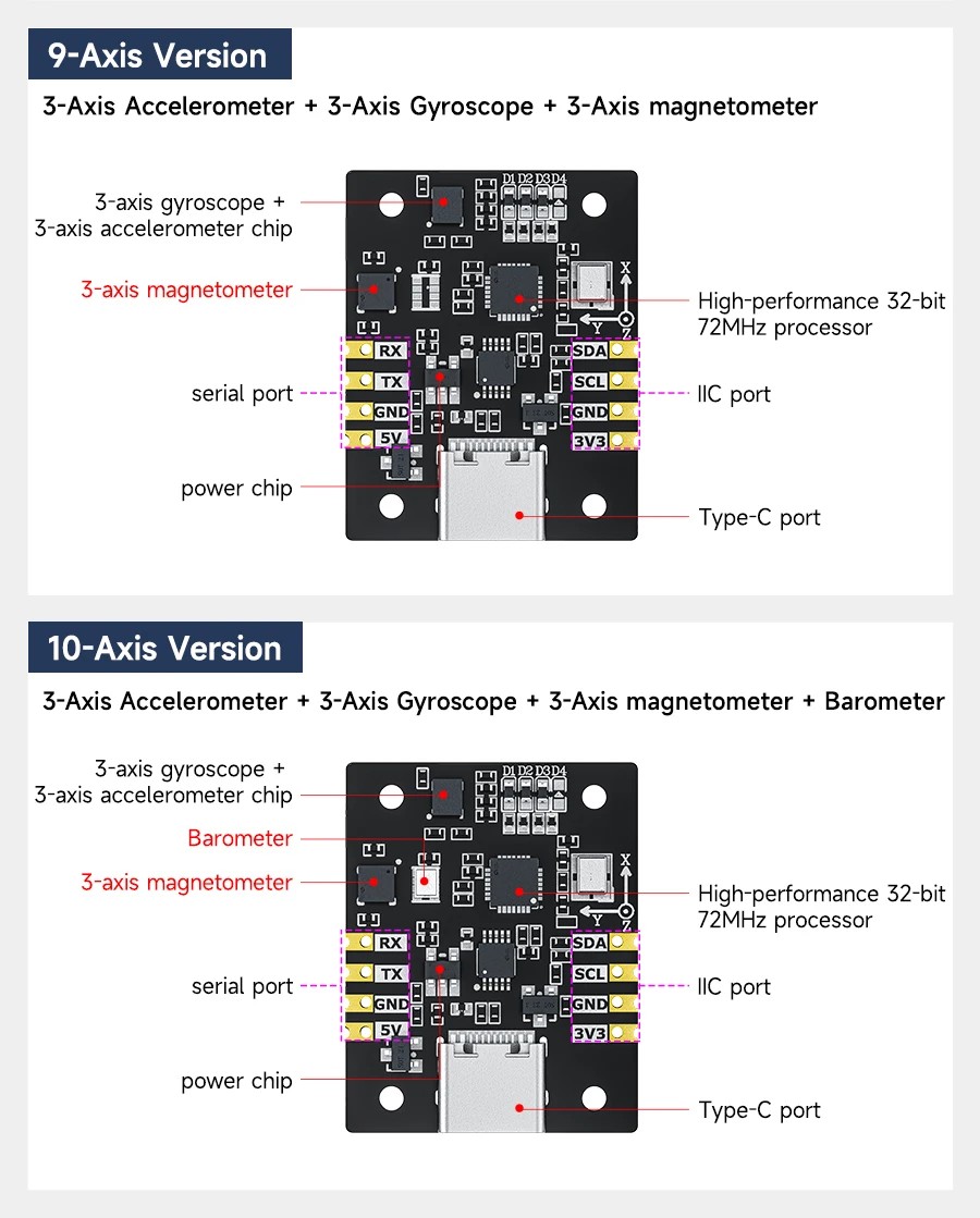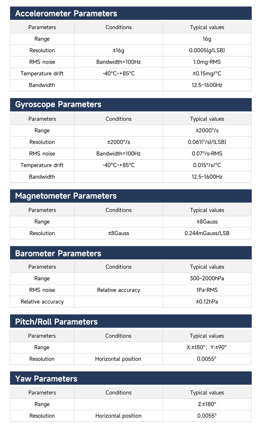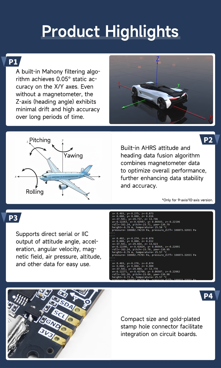 10 ejes:Agregue un barómetro de alta precisión a una base de 9 ejes que permite la medición de altitud, lo que lo hace adecuado para aplicaciones que requieren una actitud 3D y una percepción de posición más precisas.