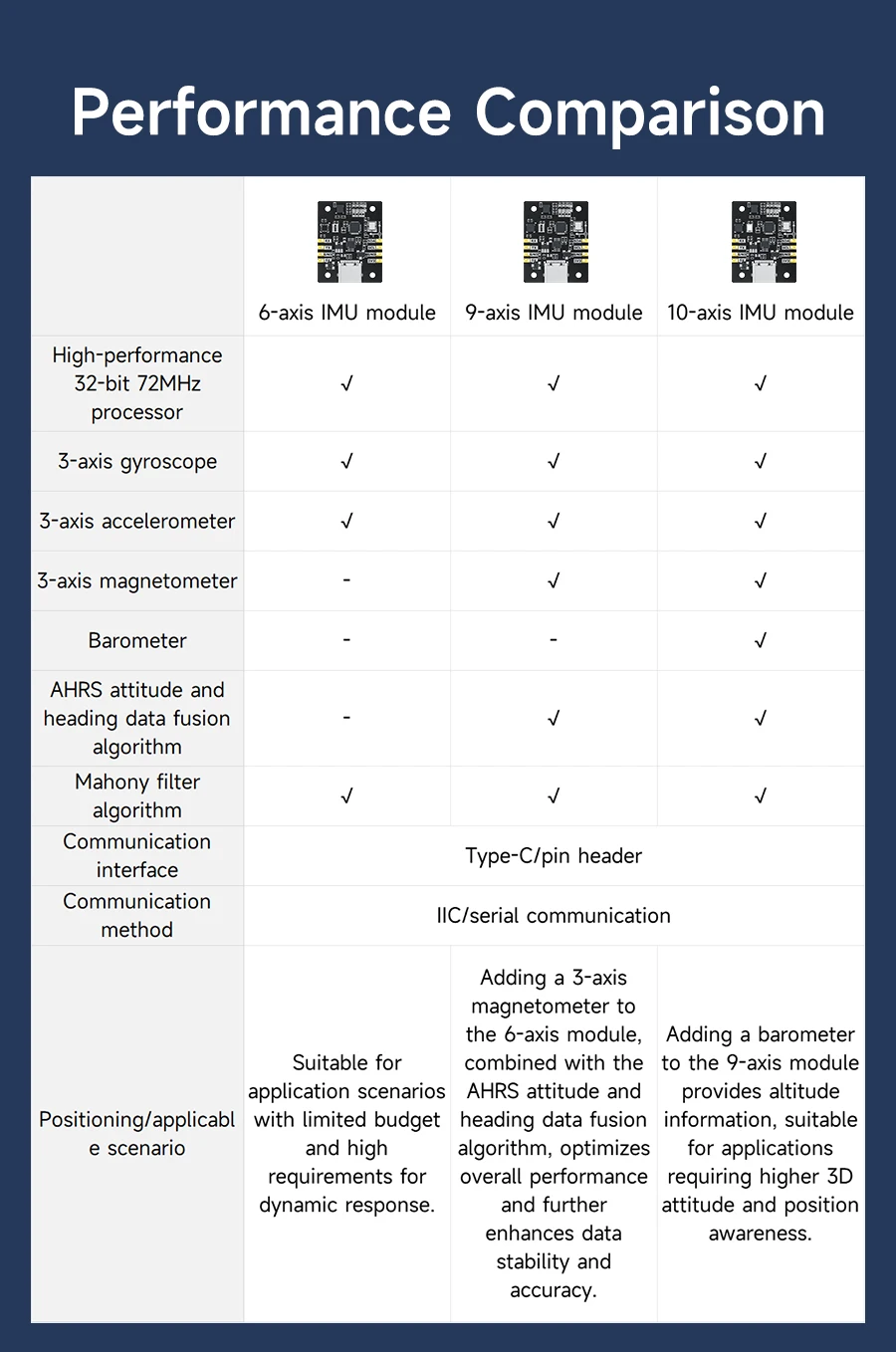 Los nuevos módulos de sensores IMU de Yahboom integran sensores MEMS de múltiples ejes, que sirven como núcleo para el seguimiento del movimiento y la medición de actitud.Construido con un procesador de 32 bits y 72 MHz de alto rendimiento, admite cálculo de actitud en tiempo real y compensación dinámica.Puede integrar profundamente datos desde giroscopios, acelerómetros y magnetomómetros para generar ángulos de actitud precisos (rollo, tono y guiñada) e información de aceleración de 3 ejes.Ya sea inicialización dinámica de 6 ejes o detección de escala completa de 9 o 10 ejes con magnetomómetros y barredores, puede proporcionar soluciones de datos de movimiento estables, confiables y de alta precisión para sus robots de bricolaje, drones, agricultura inteligente y navegación. aplicaciones.