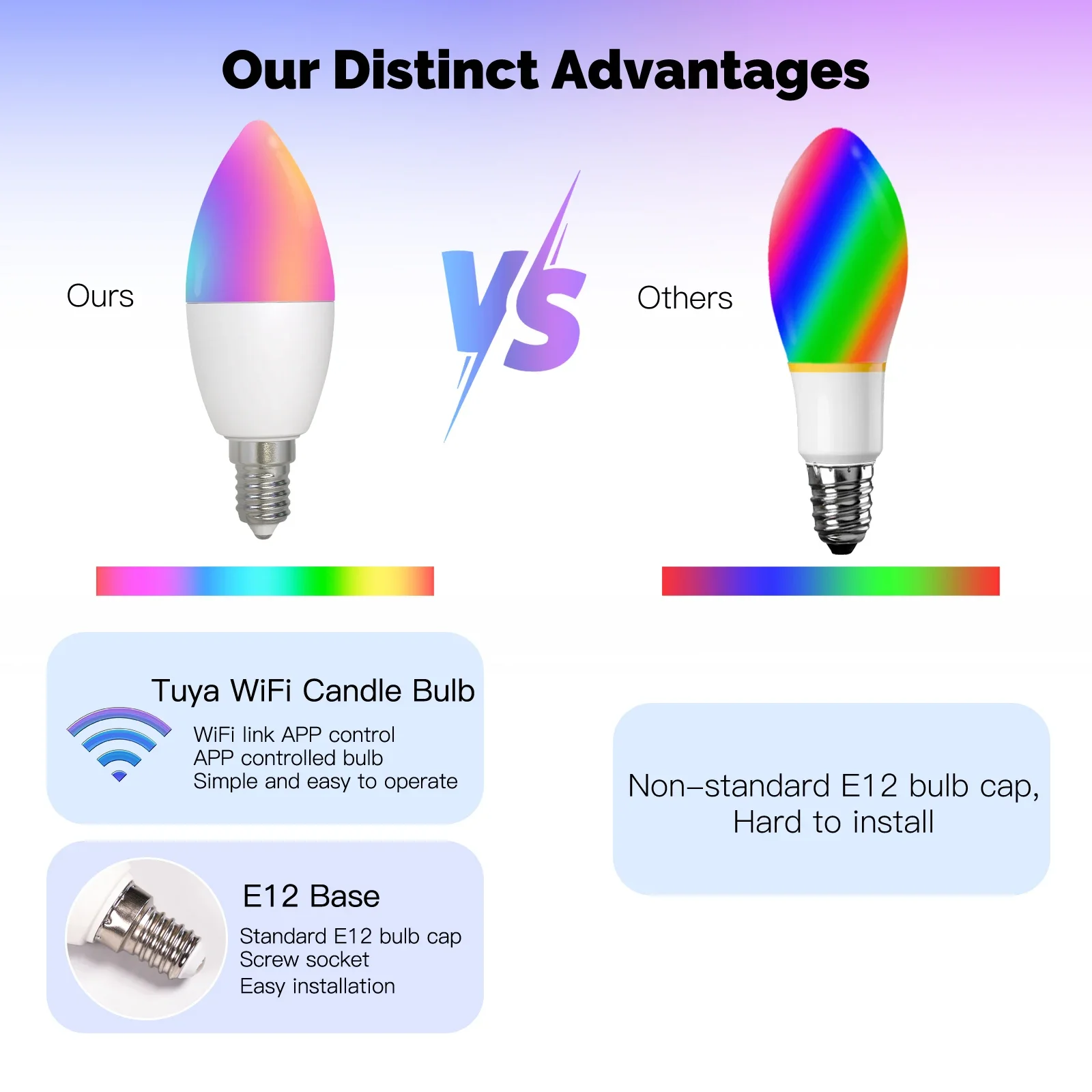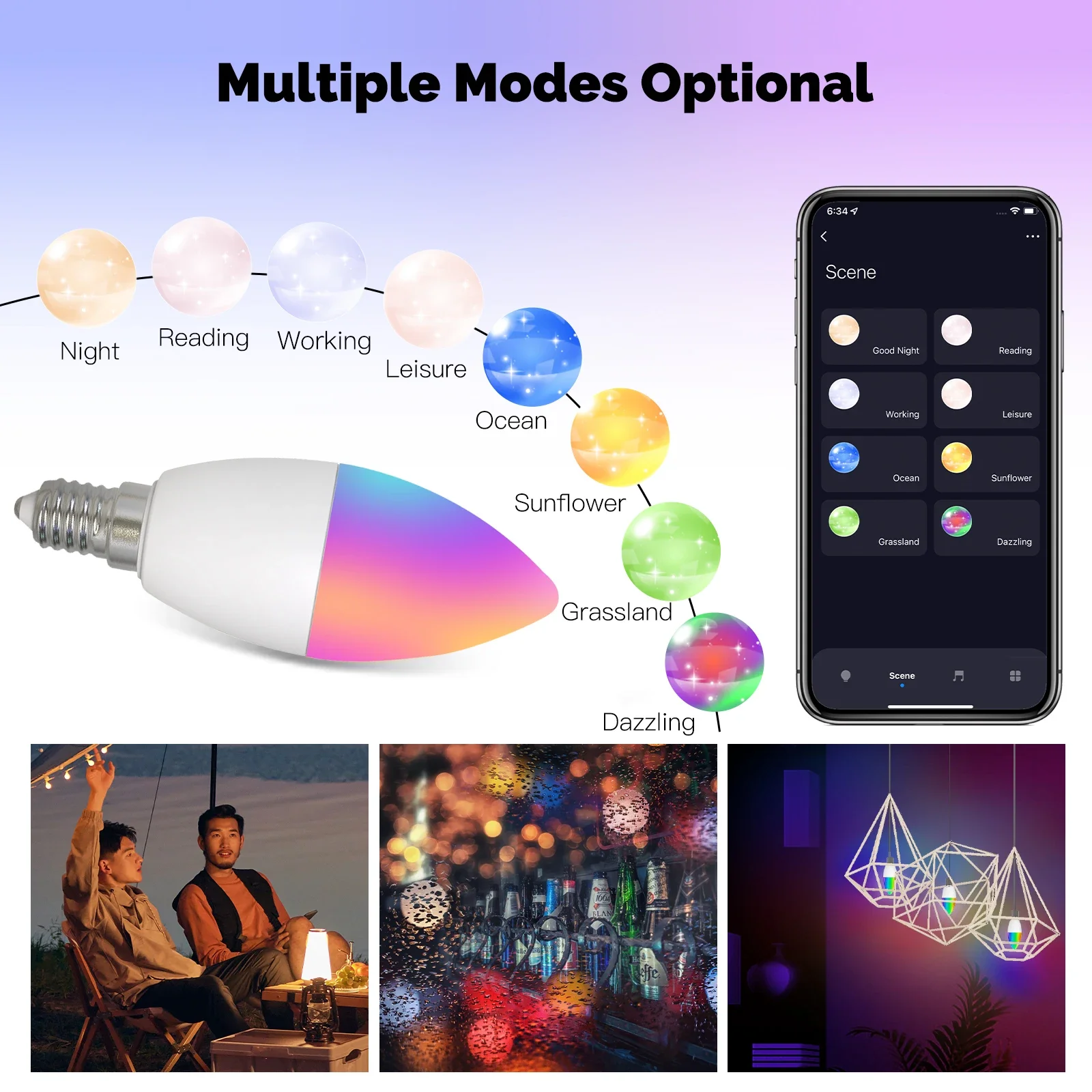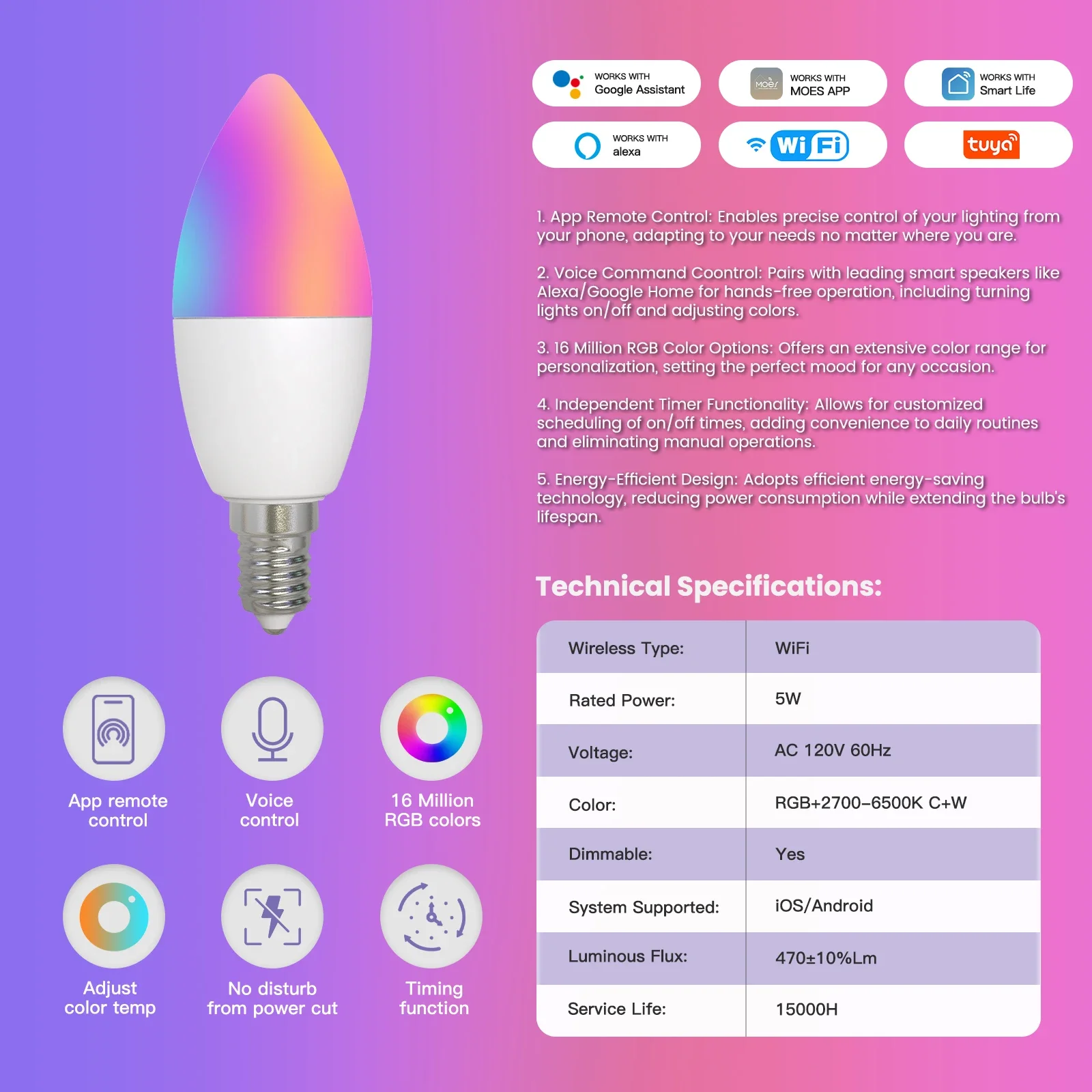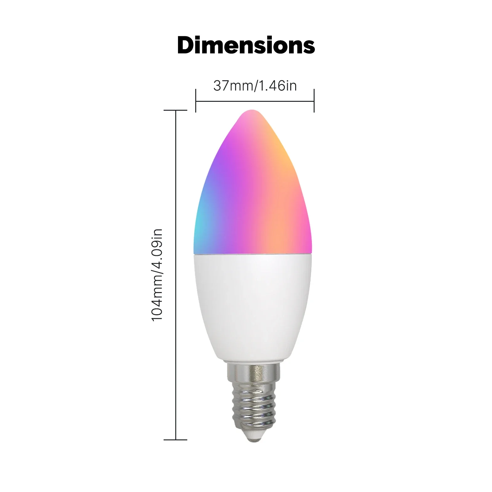 MOES Tuya WiFi inteligente E12 5W 1600 millones de colores vela luz LED candelabro bombilla RGBCCT 2700-6500K Alexa Google Control de voz Bombilla de vela inteligente con base E12 Hazlo tú mismo con 16 millones de colores RGB RGB: 16 millones de colores ajustables Rango de atenuación del 1% al 100% Horario de sueño Control por voz Bombillas inteligentes integrales Con un toque en tu teléfono móvil a través de la aplicación MOES, Puedes controlar la iluminación inteligente de toda la casa, para que las manos inteligentes puedan liberarse. Control remoto inalámbrico Habilite de forma remota el modo de lectura para que su hijo disfrute del mejor entorno de aprendizaje. 1%-100% Brillo y temperatura de color ajustables Admite cualquier ajuste de brillo, Temperatura de color de 2700K a 6500K para seleccionar el color claro y frío requerido y la temperatura de color cálido. Nuestras ventajas distintivas La tapa de la bombilla E12 estándar se puede conectar fácilmente al portalámparas E12 de casa, para que la bombilla inteligente pueda servir la vida. Función de sincronización de música Con la intensidad del ritmo de la música, las luces se pueden cambiar de forma sincrónica, aportando un maravilloso disfrute visual y una atmósfera. Múltiples modos opcionales Elija un modo de escena luminosa a voluntad, sin otras configuraciones complicadas, Encuentre fácilmente el modo de luz que cumpla con la escena actual. Compartir en familia Comparta el control de luces inteligentes con su familia mediante la aplicación MOES. Dimensiones