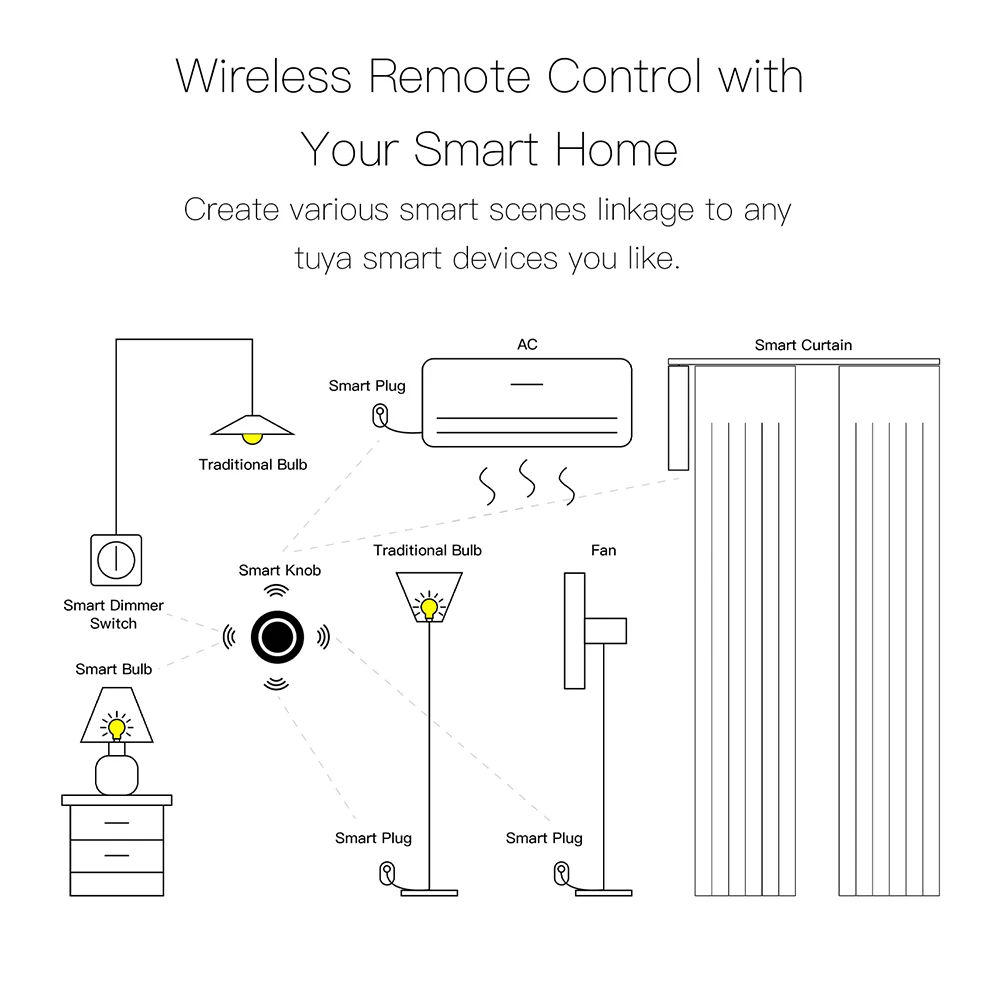 1. Dispositivo dos en uno para interruptor inalámbrico de escena y atenuador: una nueva idea para el interruptor de escena ZigBee para crear varias escenas inteligentes para sus dispositivos inteligentes Tuya en la aplicación Smart Life; toca para ejecutar para obtener otro control más fácil para todos los dispositivos inteligentes tuya con operaciones simples en el interruptor.