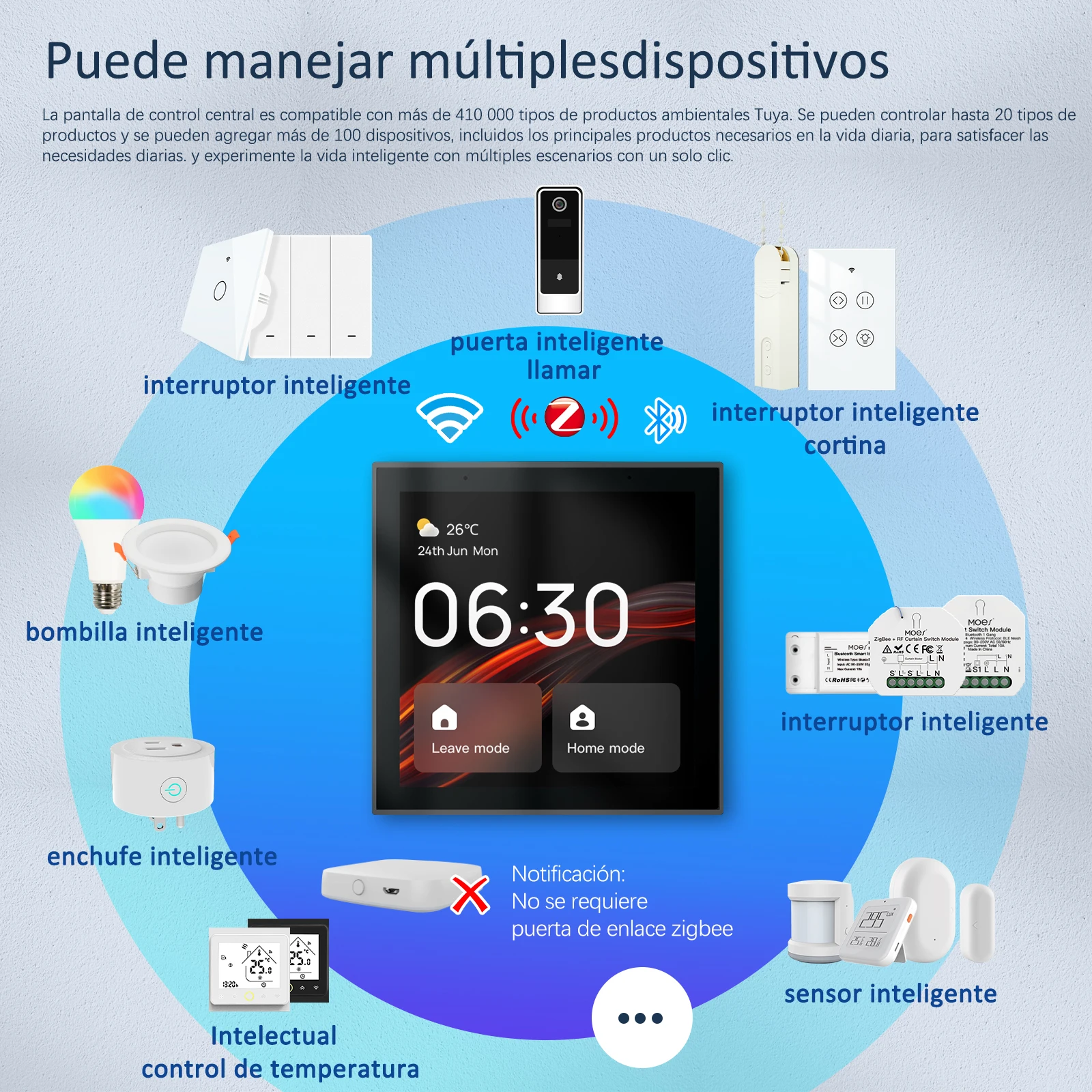 El Panel, compatible con más de 410000 productos Tuya eco, puede controlar hasta 20 tipos de productos y añadir más de 100 dispositivos, para satisfacer sus necesidades con un solo clic para experimentar la vida inteligente de múltiples escenas.