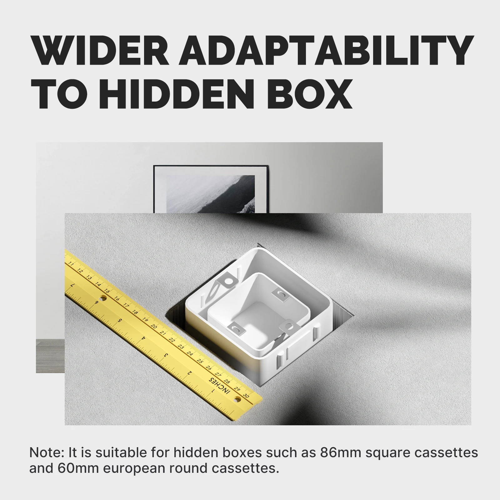 El tamaño compacto facilita la instalación en los diferentes tamaños de caja oculta, como casetes cuadrados de 86mm y casetes redondos europeos de 60mm.