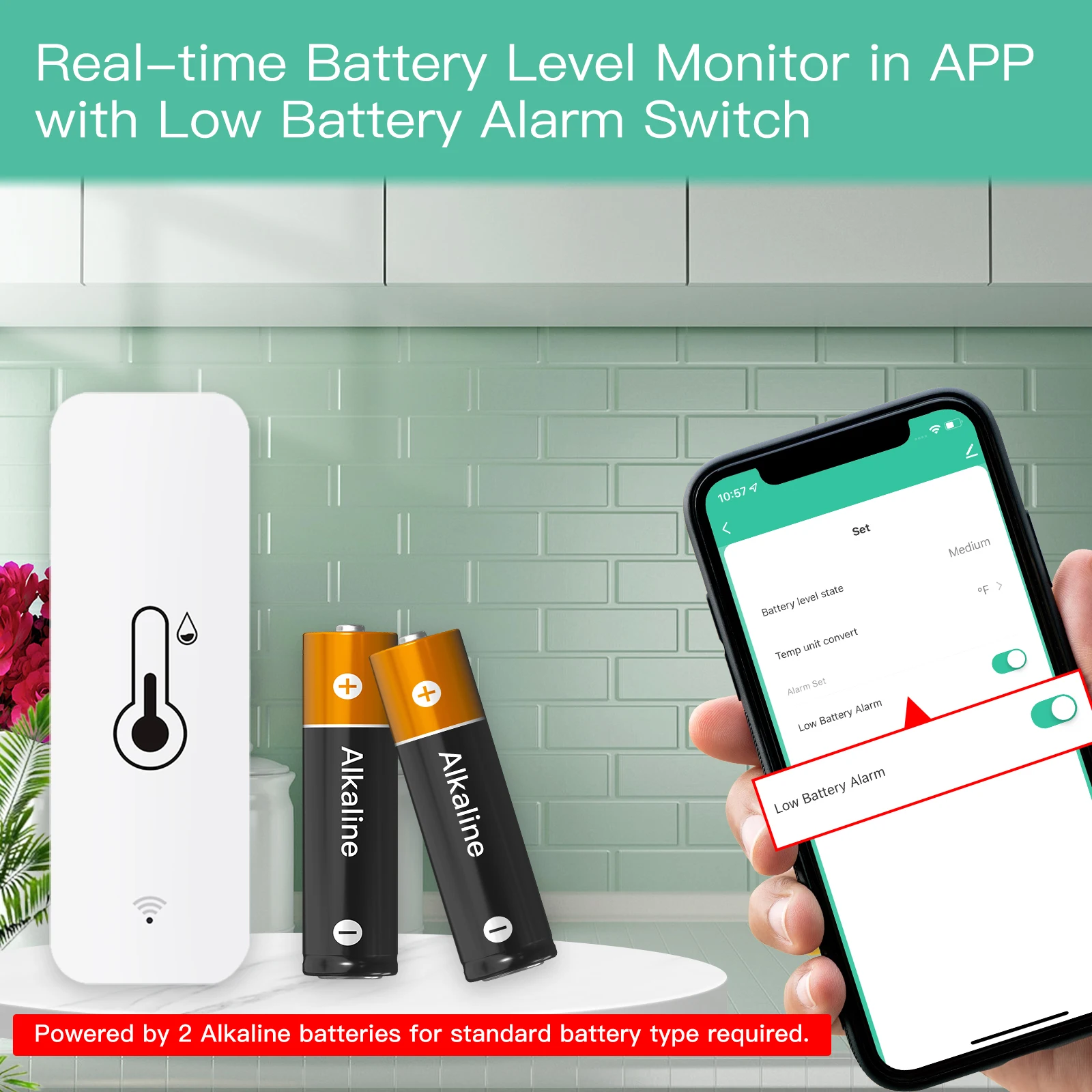 2. Costo extremadamente bajo con batería para una percepción precisa en tiempo real de la temperatura y la humedad de la casa, junto con el estado del nivel de la batería y la alarma de batería baja funcional en la aplicación Tuya Smart. Temporal. La unidad convierte entre ℃ / ℉ para una fácil lectura según sus propias necesidades.