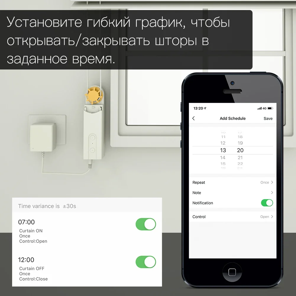 Establezca un horario flexible para abrir/cerrar sus cortinas en un momento preestablecido.