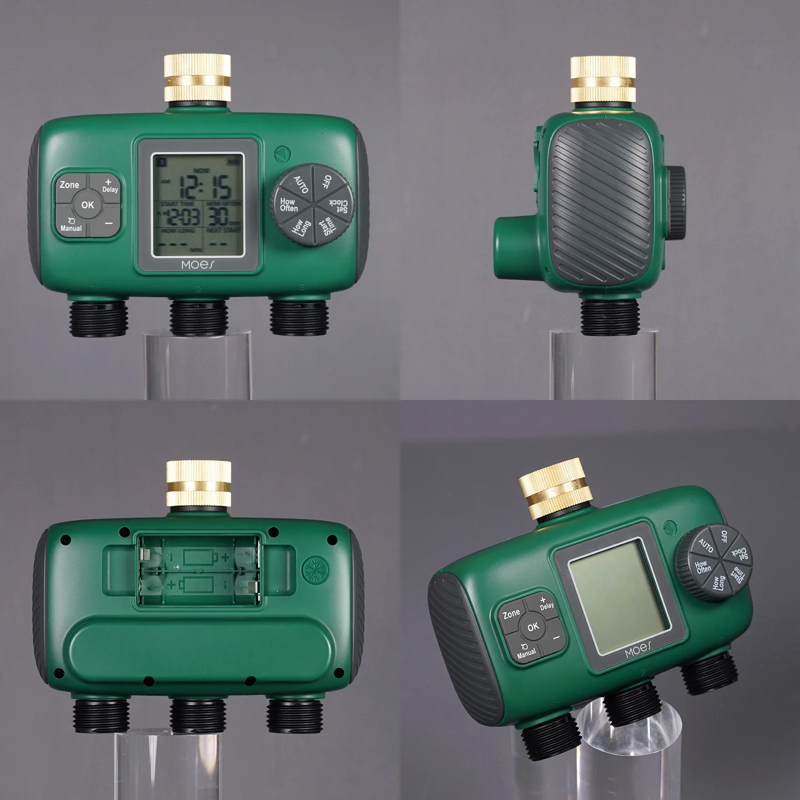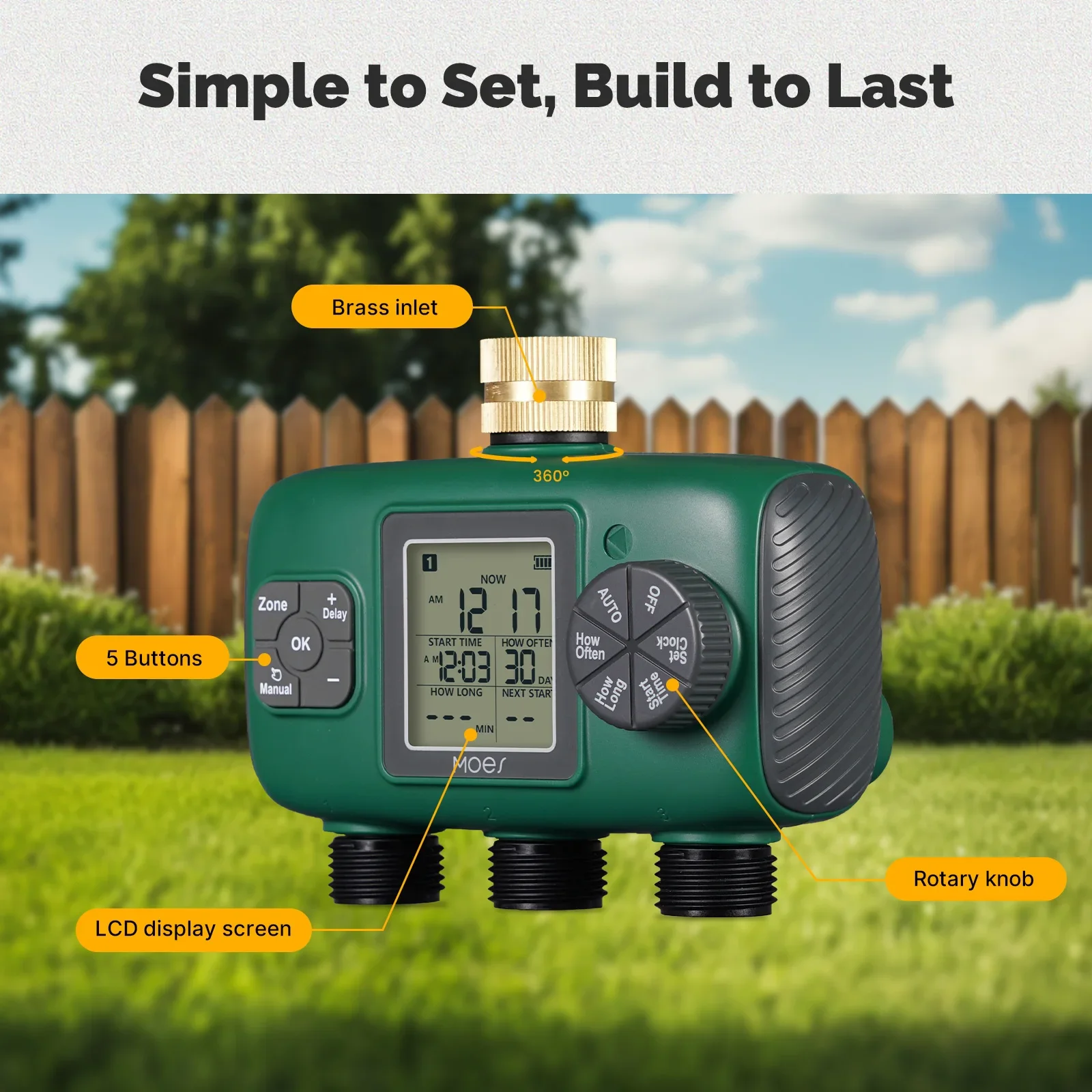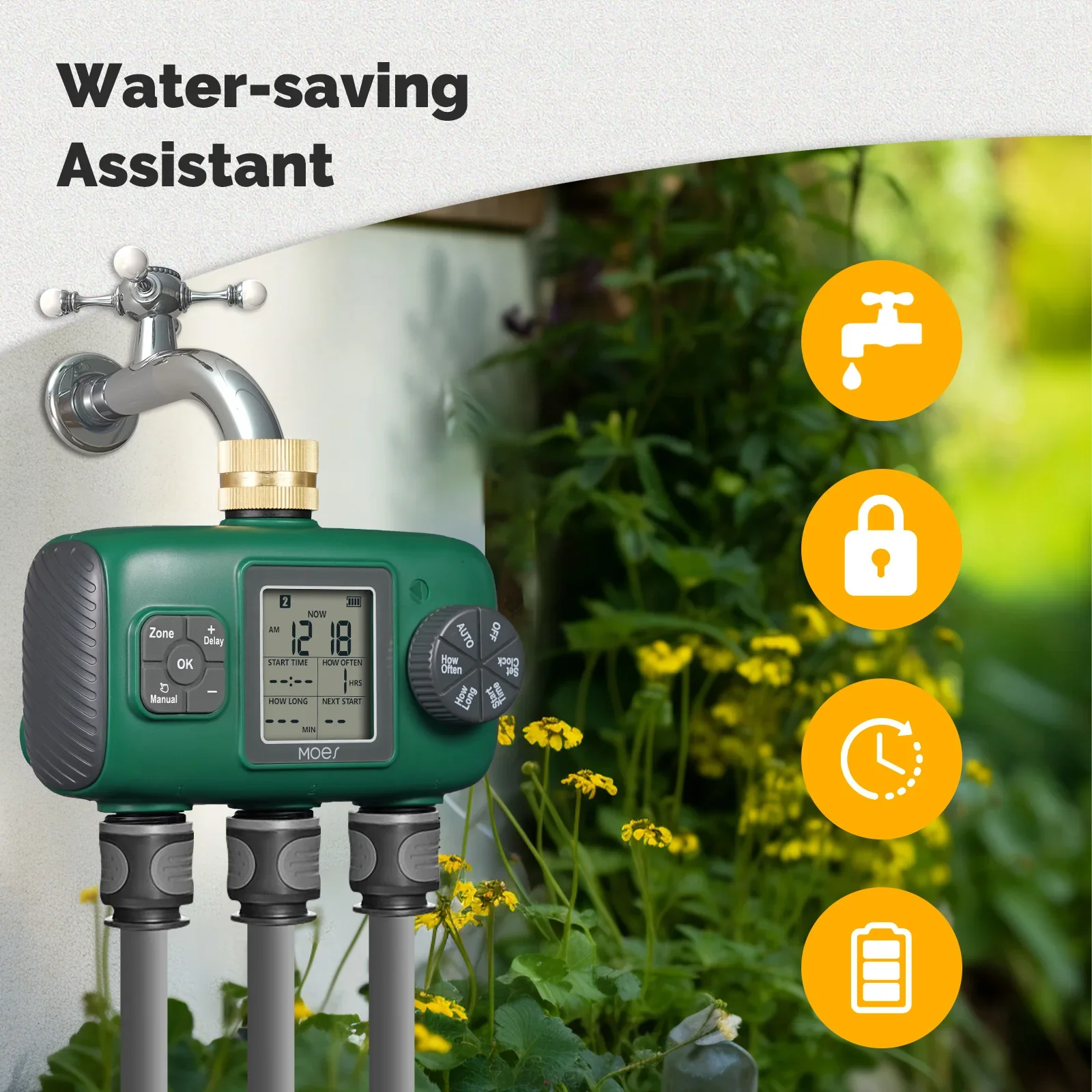 Seleccione el tiempo de riego y el programa que necesita ajustar a través de la perilla y cuatro botones, y preséntelo en la pantalla LCD, lo cual es conveniente e intuitivo.