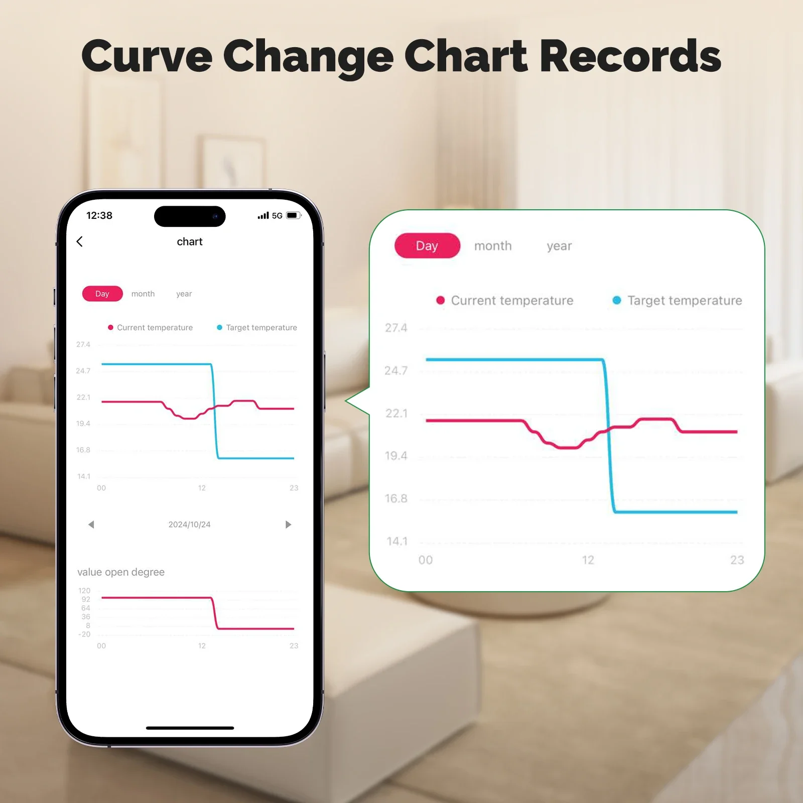 The APP will record the changes in ambient temperature and heating temperature in units of days/months/years, as well as the changes in valve opening according to the synchronous changes in temperature. The curve changes are more intuitive and visible.