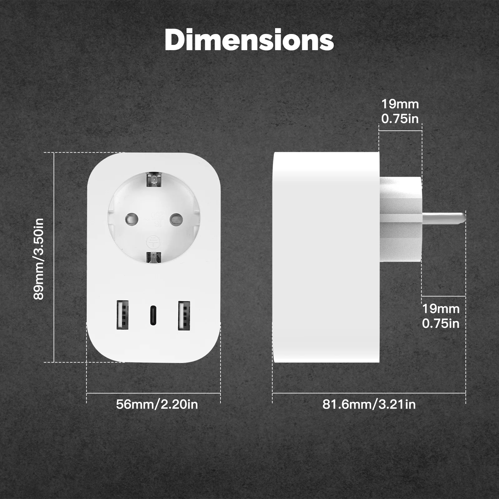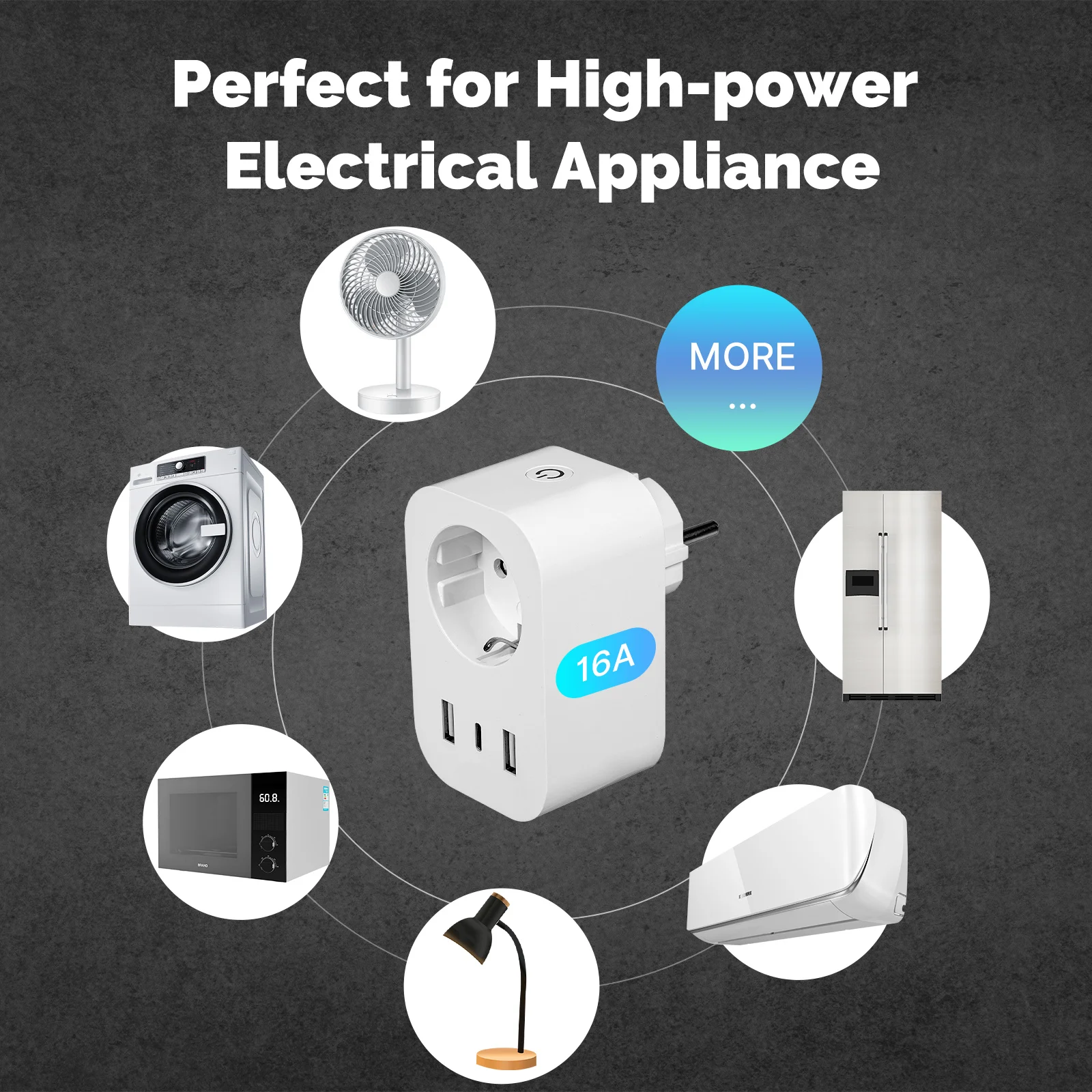 MOES Tuya WiFi enchufe inteligente 16A enchufe europeo 2USB 1TipoC Monitor de electricidad de potencia de carga rápida funciona con Alexa Google Home POR-MOES Enchufe multipuerto todo en uno