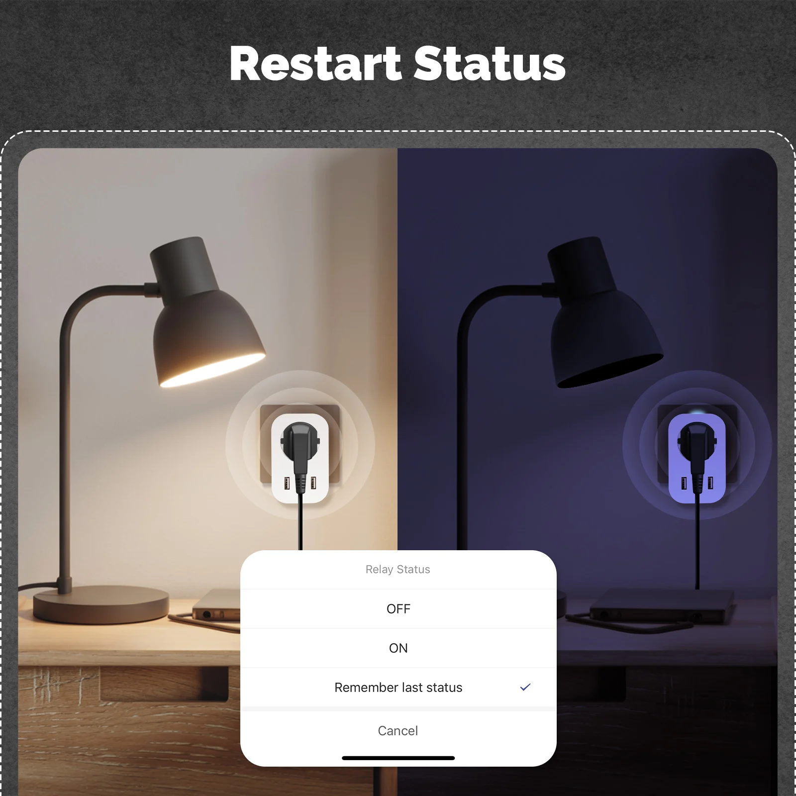 Estado de reinicioNo más preocupaciones por el estado después de un corte de energía inesperado.Configure el estado de encendido en la memoria de encendido, apagado o apagado a través de la APLICACIÓN para garantizar que cada uso cumpla con sus expectativas.