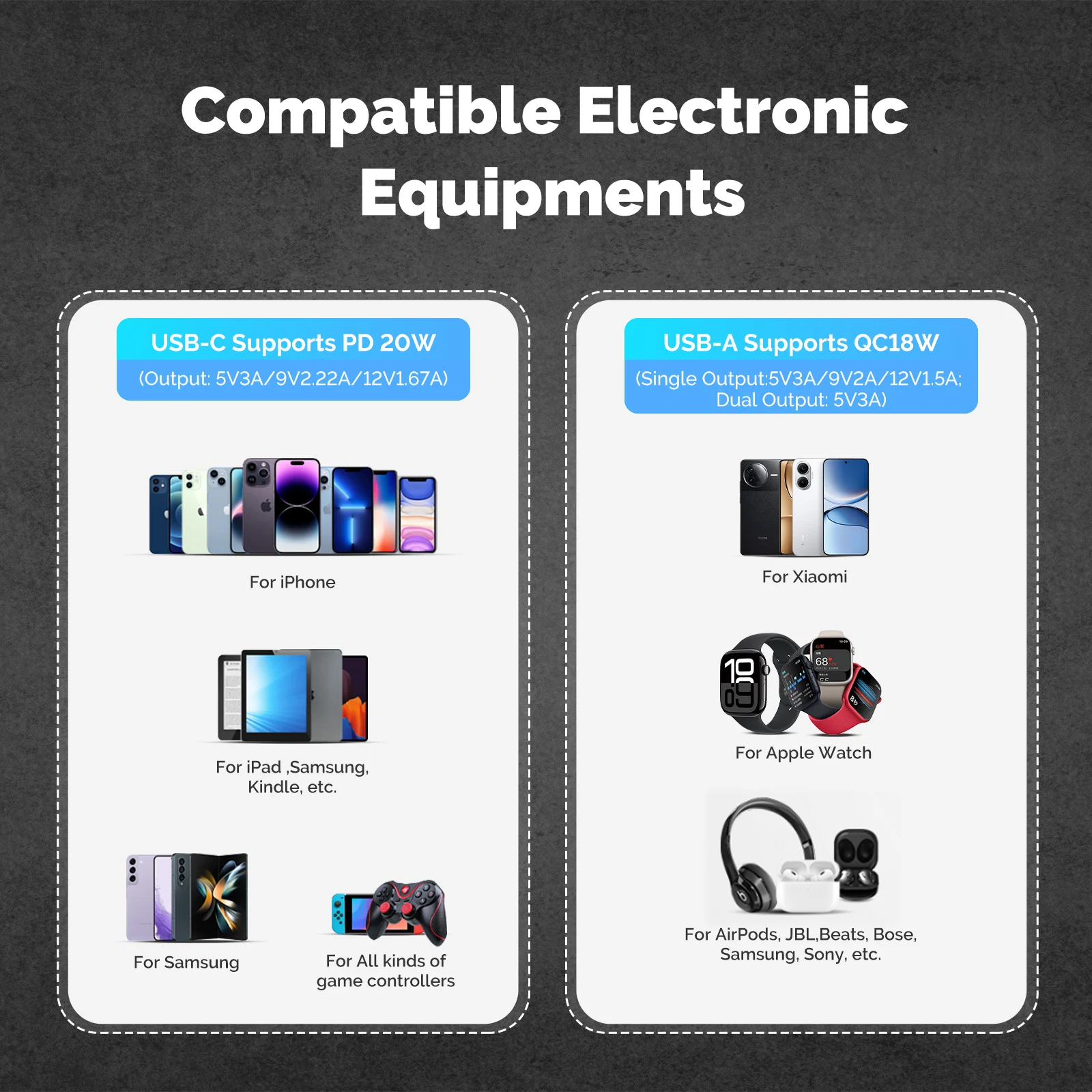 Equipos electrónicos compatiblesCarga rápida para su teléfono, tableta y más.Type-C PD 20W y USB-A QC 18W mantienen todos sus dispositivos listos para funcionar.